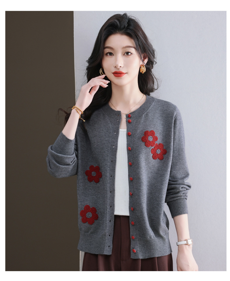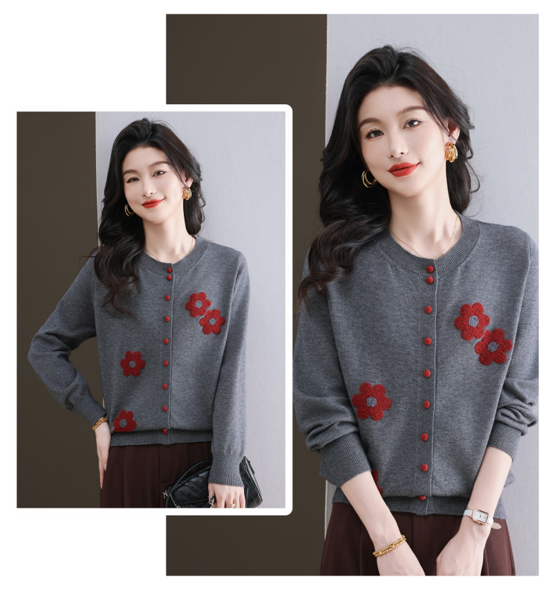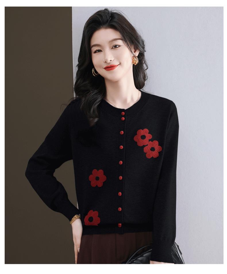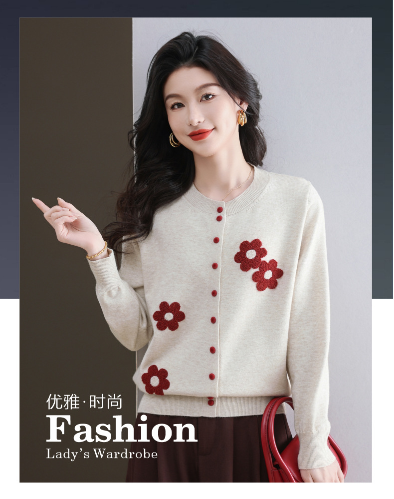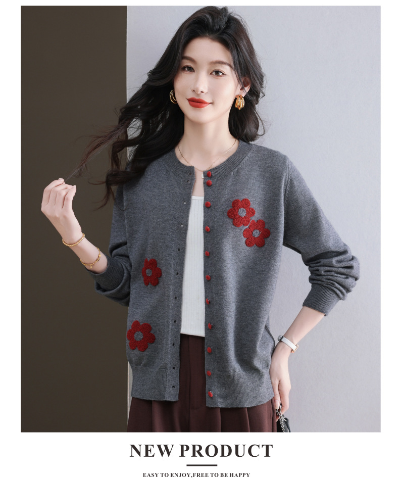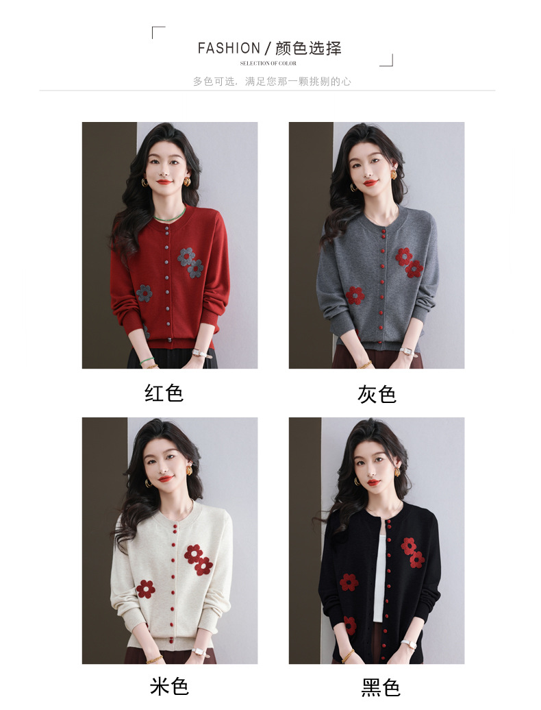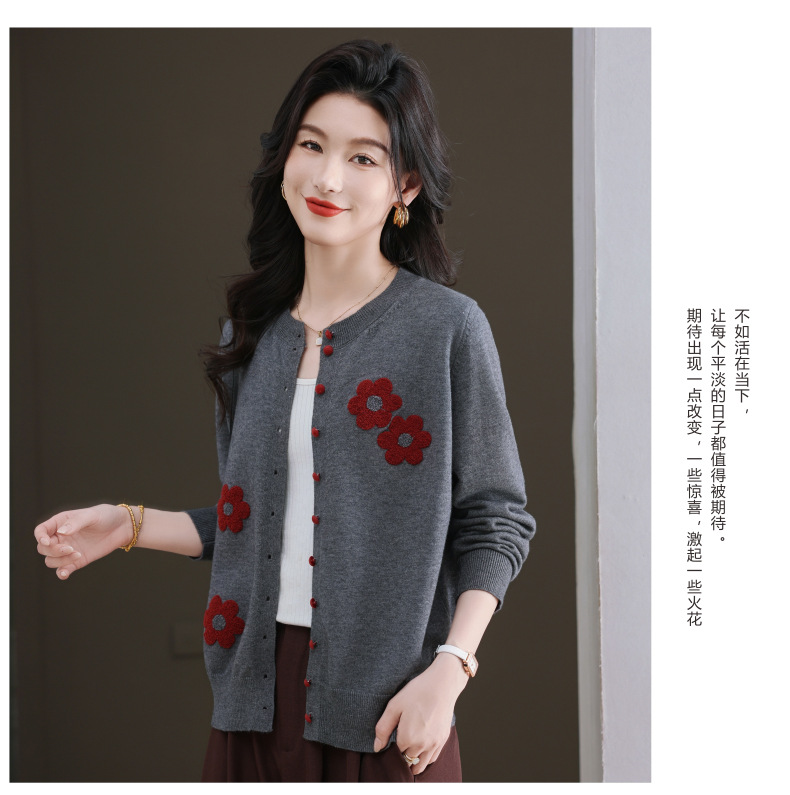 CC-11-9115小个子针织开衫女士2025春秋季新款洋气提花朵圆领薄外套外搭上衣