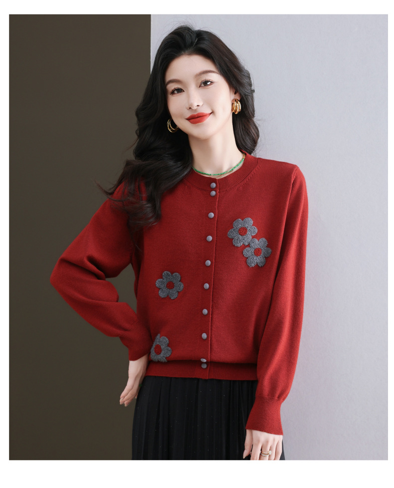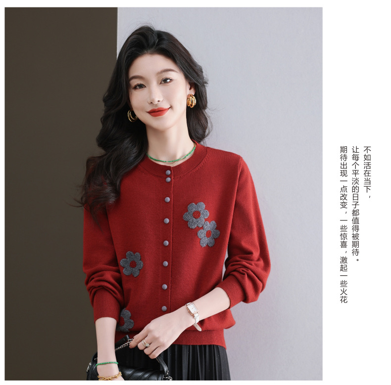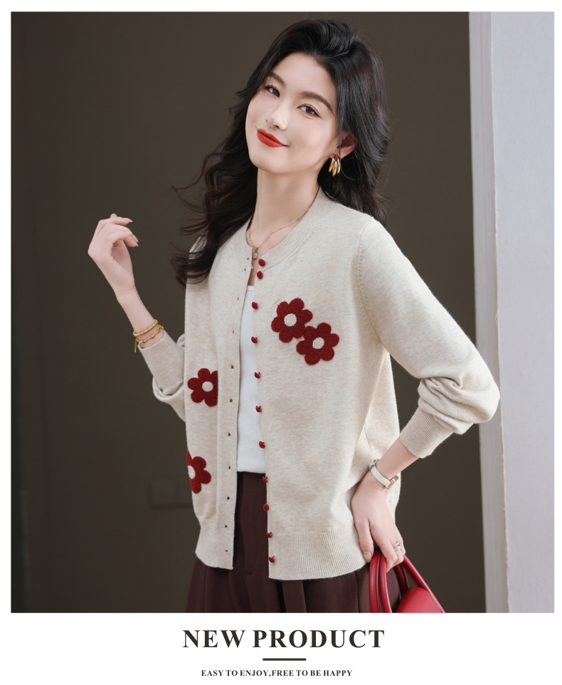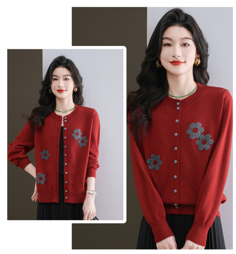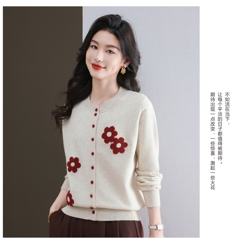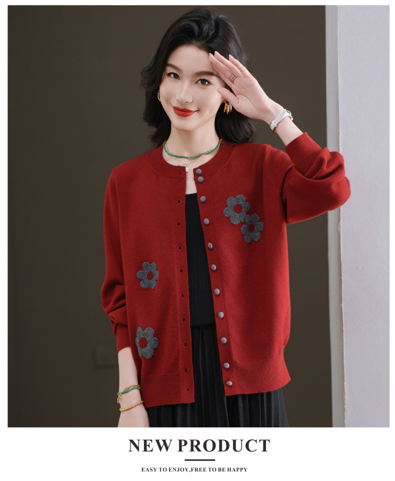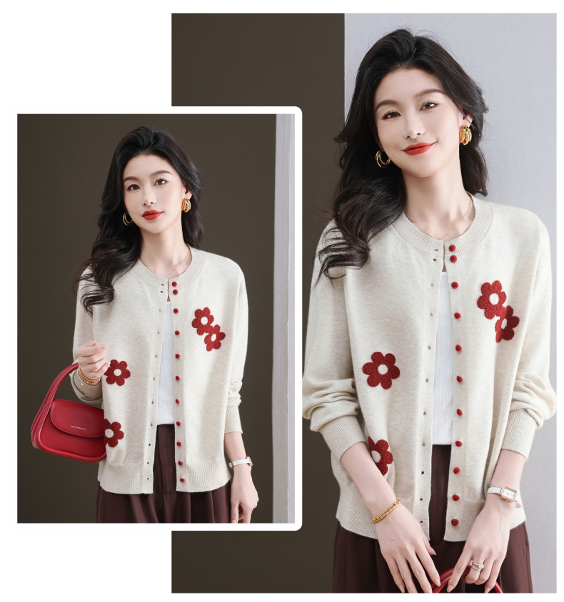 CC-11-9115小个子针织开衫女士2025春秋季新款洋气提花朵圆领薄外套外搭上衣