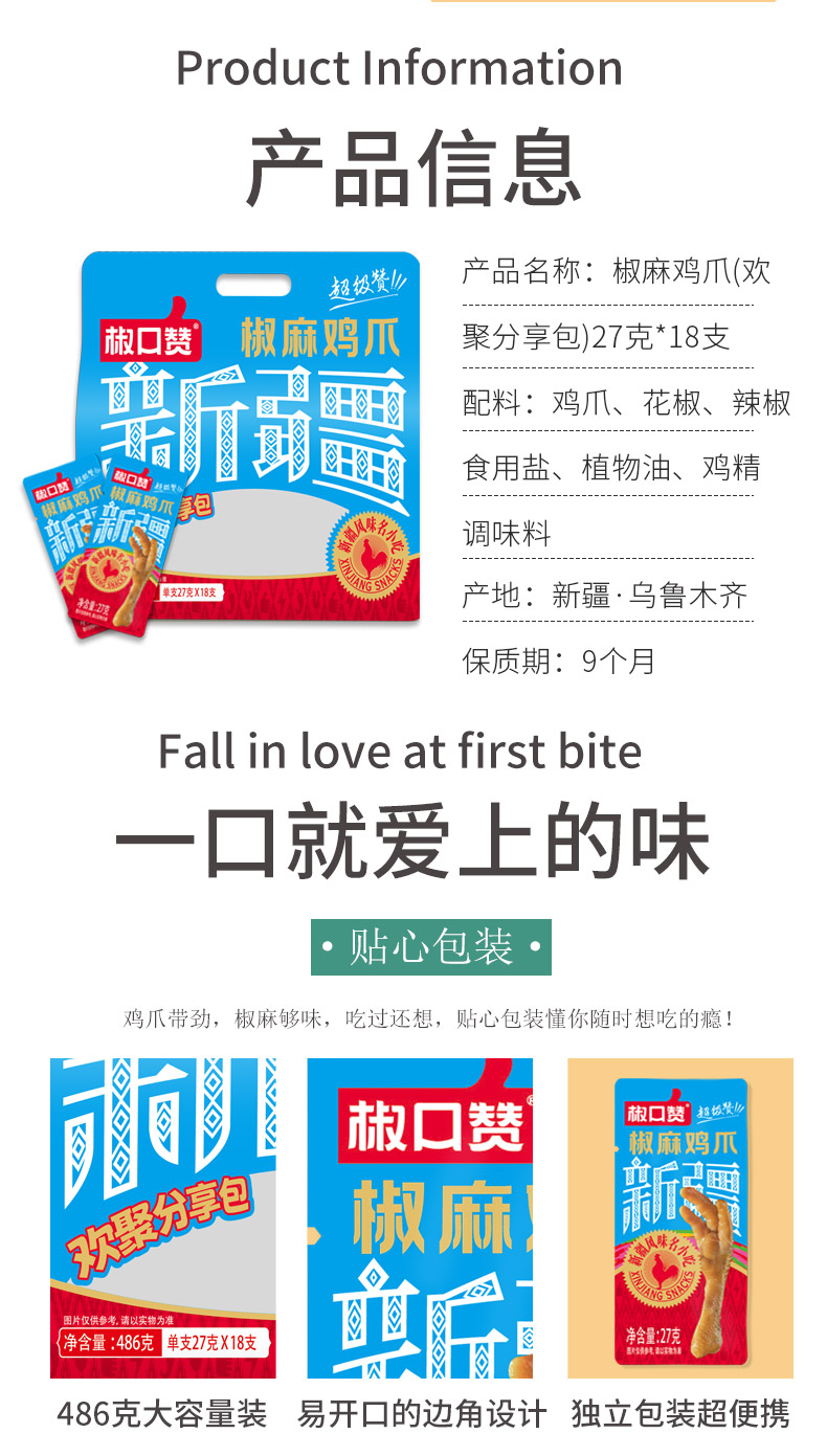 椒口赞·椒麻鸡爪欢聚分享包486g (27g*18支装) 低脂美味 皮滑肉嫩口感丰富
