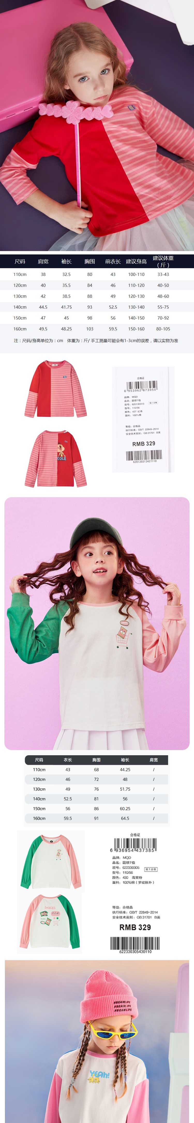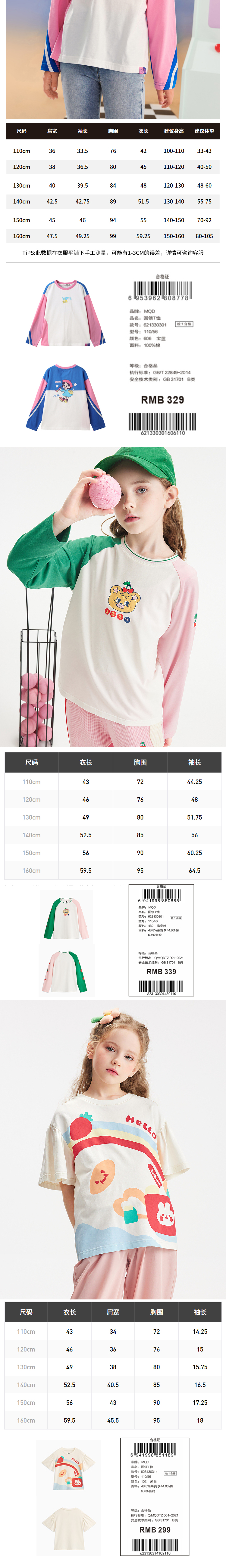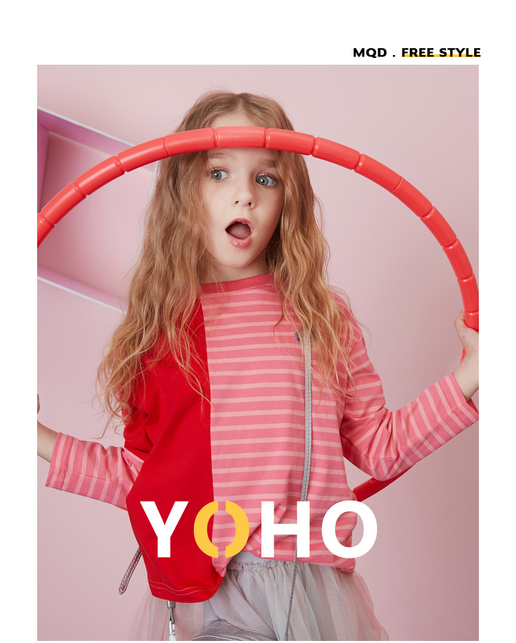 【MQD】童装女童T恤春秋季新款字母条纹拼接圆领宽松胶印落肩上衣