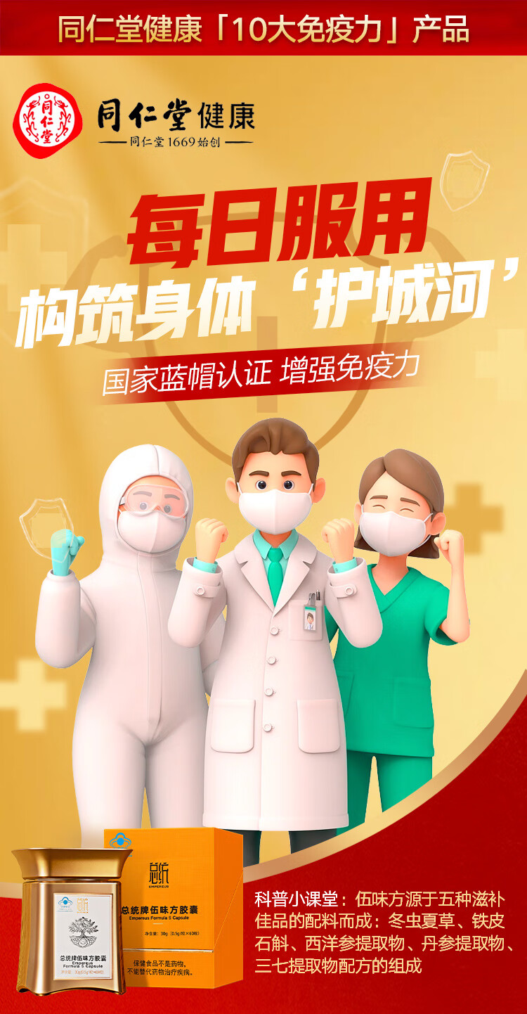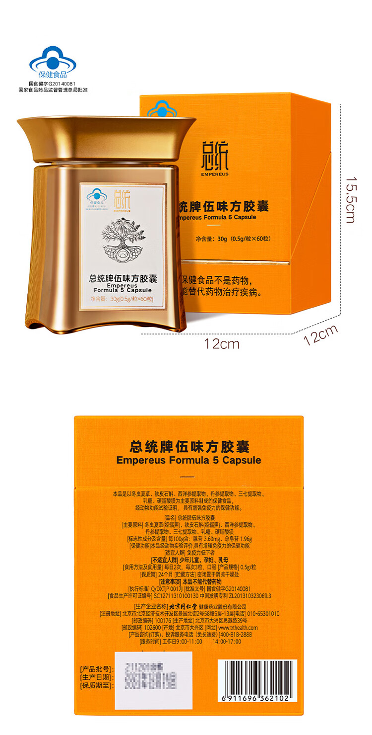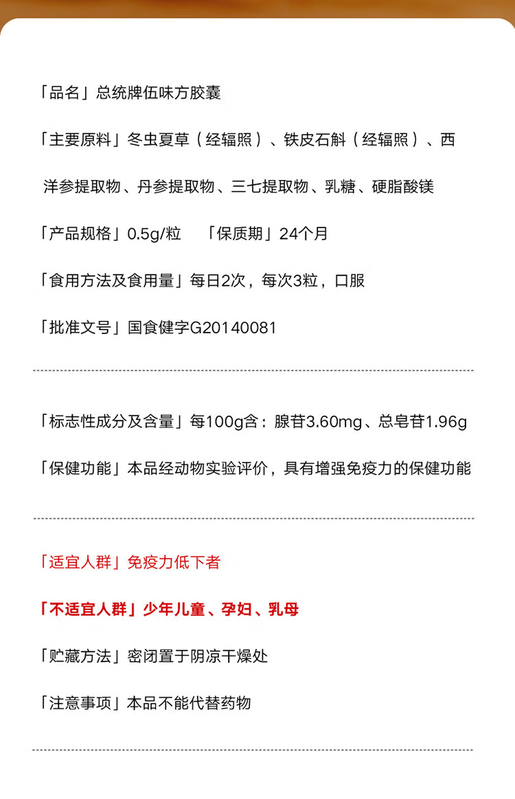 【正宗同仁堂品牌】北京同仁堂 总统牌 伍味方胶囊30g(500mg*60粒) 伍味方含冬虫夏草铁皮石斛SY