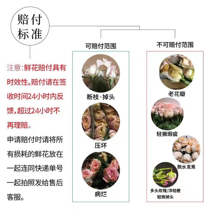 ①可赔付:断枝,压坏,撞头,腐烂(默认10%损耗不售后)均可按照受损比例售后,受损超过70%可补发或者整单退款。
