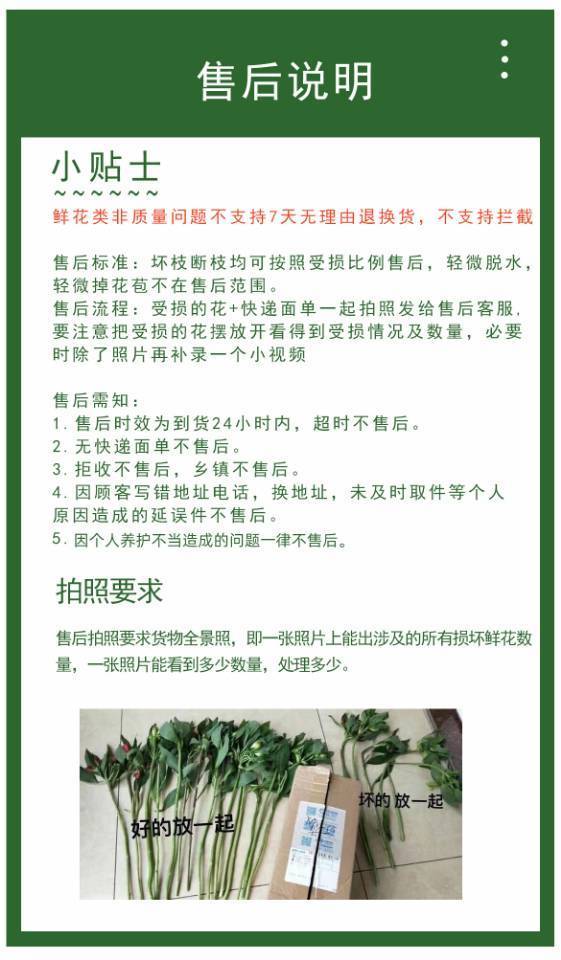 ✅售后流程:受损的花+快递面单一起拍照发给售后客服 ⚠要注意把受损的花摆放开看得到受损情况及数量,必要时除了照片再补录一个小视频。