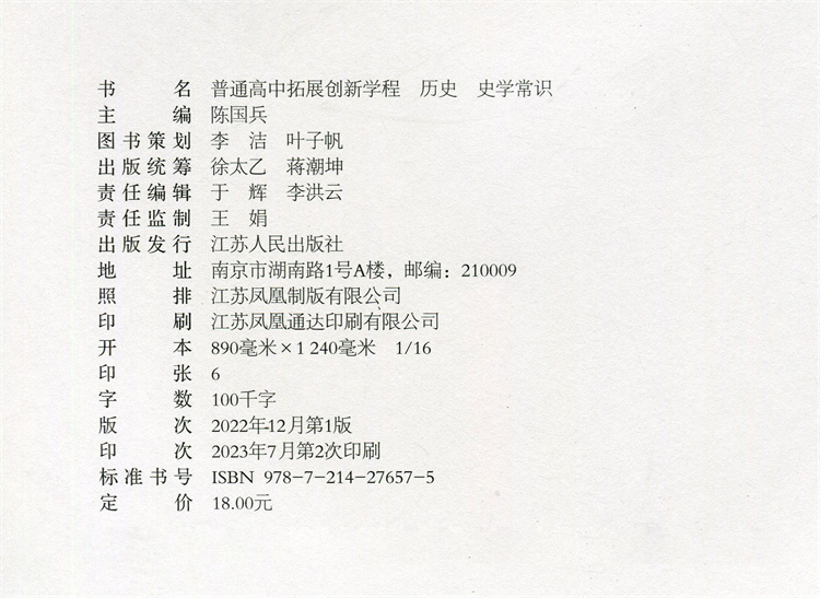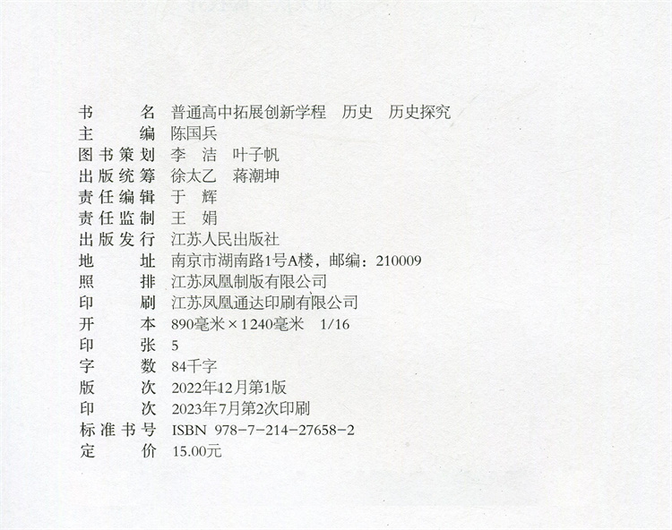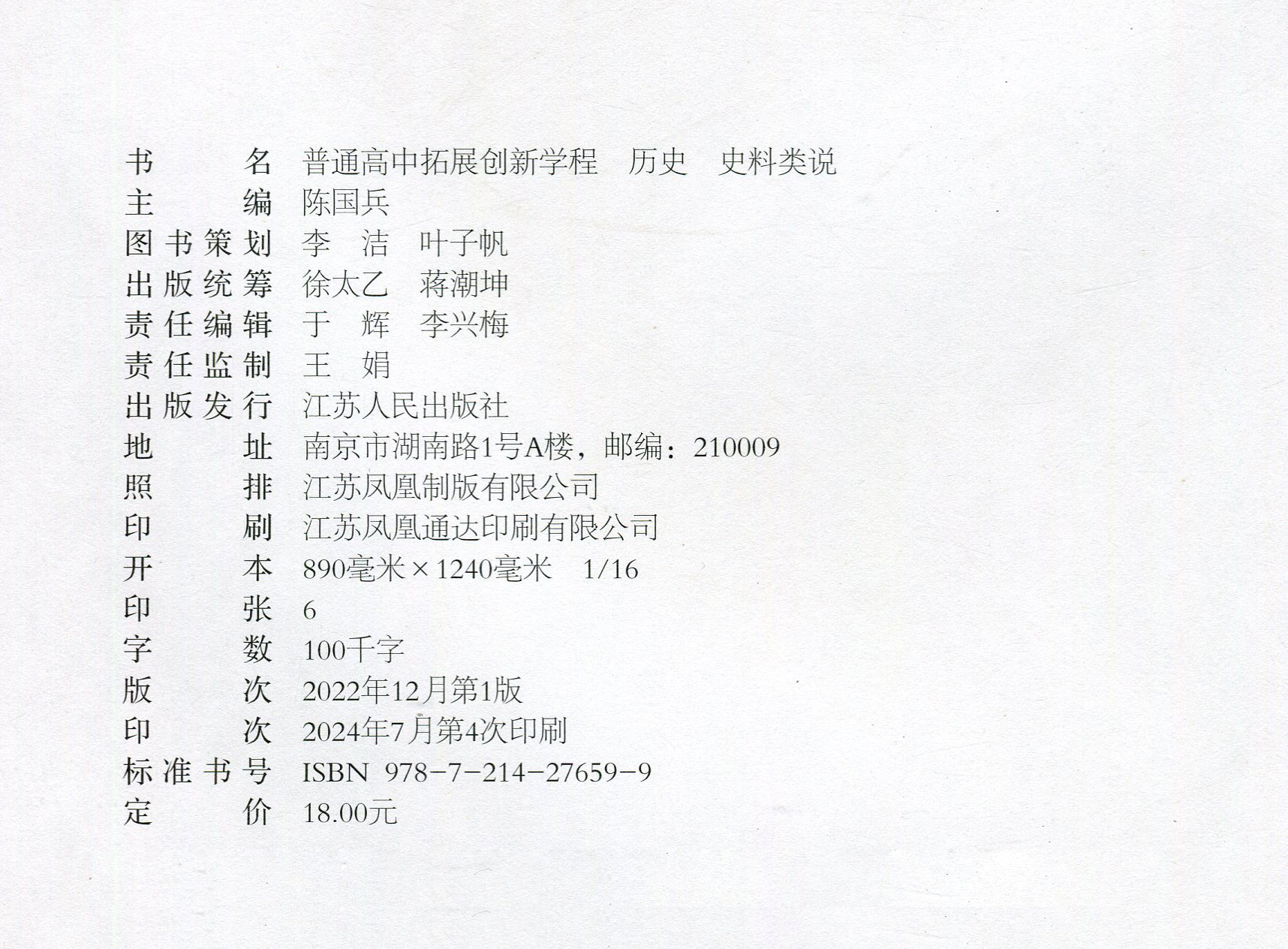 普通高中拓展创新学程 历史 历史探究/史学常识/史料类说 任选 主编陈国兵 高中课本 学生用书 江苏人民出版社