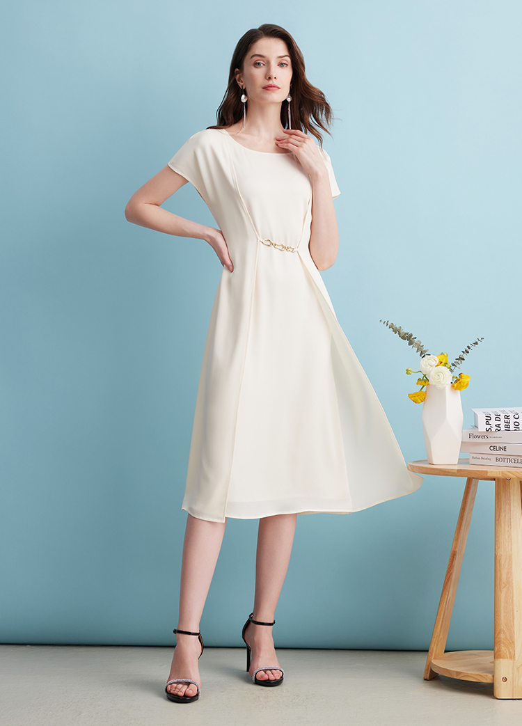 EITIE爱特爱品牌女装春季新款时尚修身高腰圆领连衣裙中裙A1907039
