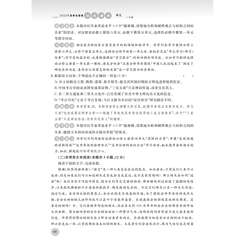 本书根据新高考考向,选取了2023年的新高考I卷、全国卷语文试题,通过对这些高考真题进行分析,阐述当年的高考语文怎么考,考什么,等等。针对高考动向,助力全国教师为下一年全国高三学生复习好、考好高中语文。本书约请江苏、山东、浙江等基础教育比较突出的几个省份的名校名师来编写,强调了出版的时效性,第一时间拿到真题信息,尽快编写并出版,第一时间供给各地教师、学生,为他们有方向性、有效地开始高三学习和复习提供支持。