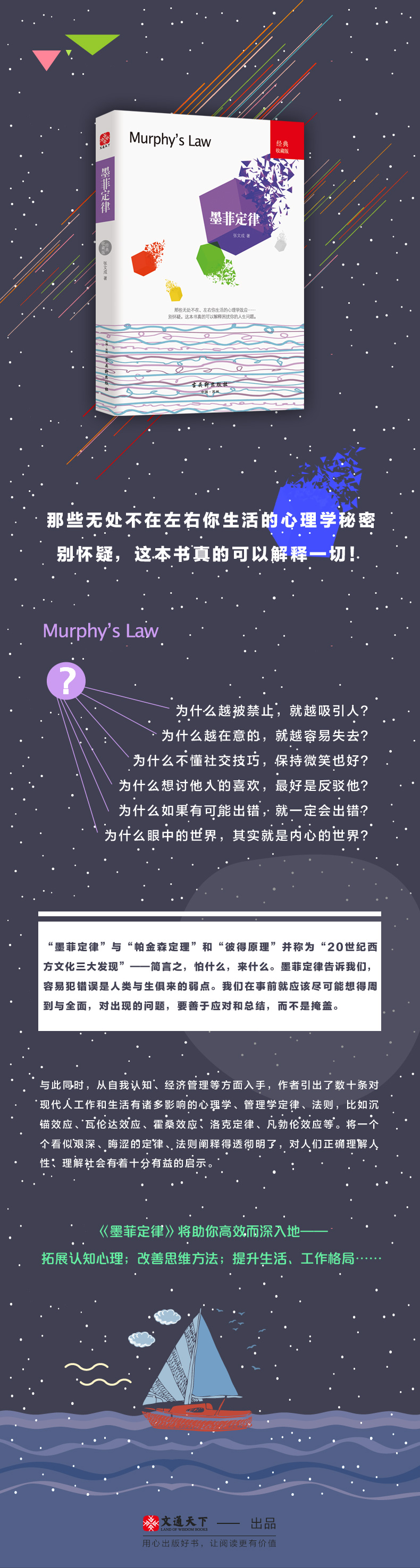 本书是一本揭示人类潜在种种心理效应的心理学通俗读物,其中*有代表性的即“墨菲定律”。与此同时,从自我认知、经济管理等方面入手,作者引出了数十条对现代人工作和生活有诸多影响的心理学、管理学定律、法则,比如沉锚效应、瓦伦达效应、霍桑效应、洛克定律、凡勃伦效应等。将一个个看似艰深、晦涩的定律、法则阐释得透彻明了,对人们正确理解人性、理解社会有着十分有益的启示。本书语言流畅,案例丰富,对于读者拓展认知心理,改善思维方法,提升生活、工作格局有着深远的指导意义。