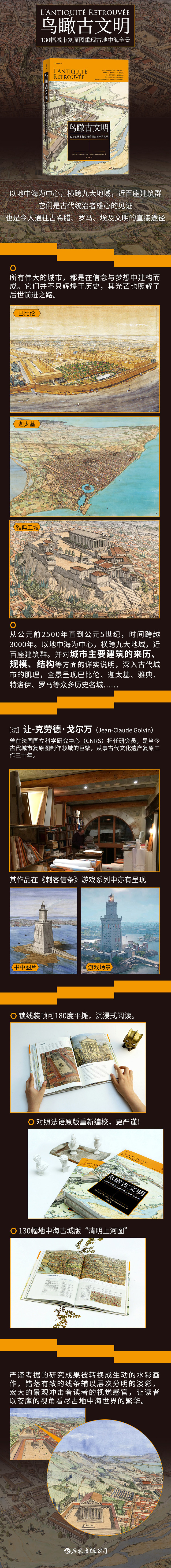 毫无疑问,古代城市复原图的绘制是一项具有挑战性的工作,而本书作者让-克劳德·戈尔万及其团队用丰厚的考古学、建筑学知识,以及他出色的绘画天赋达成了目标。他用细腻的水彩画直接呈现了古地中海文明,从公元前2500年直到公元5世纪,时间横跨3000年。130幅复原图配以文字,精心介绍了87个地区与城市,将美索不达米亚、古埃及、古希腊和古罗马一网打尽,其中不仅铕被各类史书反复提及的重要城镇,还有曾经辉煌一时却被人遗忘的诸多地方。每一幅图画都是成千上万条信息的结晶,甚至一幅图中浓缩了一座城市数佰年的历史,值得人们细细品味。