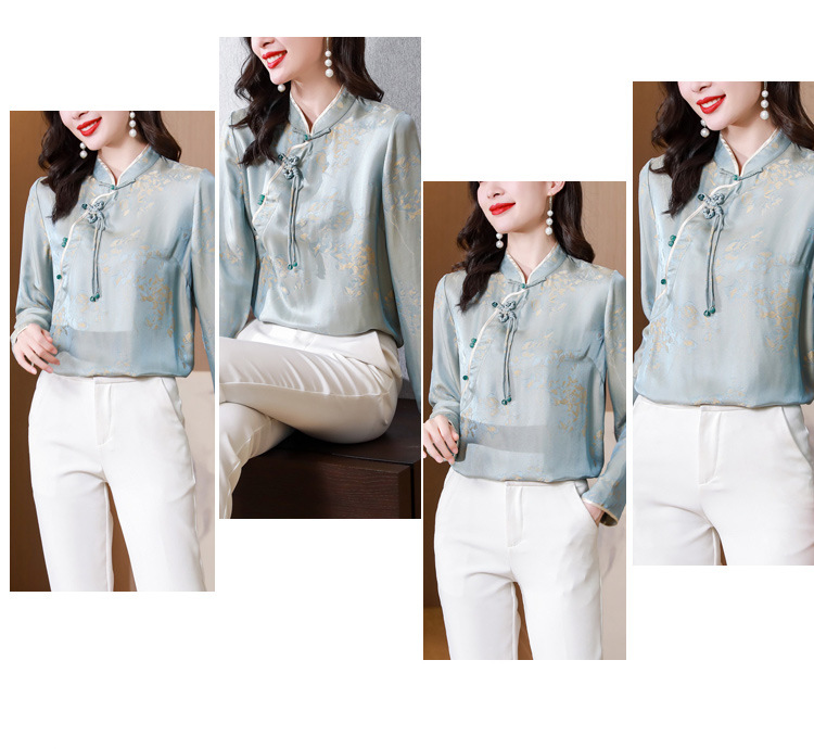 KQL-B43N8287 国风仿真丝衬衫女2023春新款复古盘扣提花衬衣别致漂亮衬衣