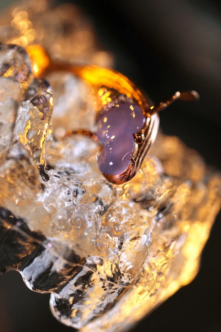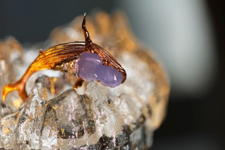 紫鲸鱼,主石有着十足的存在感。冰种紫翡的颜色,又正又美,鲸鱼肚子延伸出白金和白钻,好似浪花闪烁,配合玫瑰金的镶嵌,过渡自然。