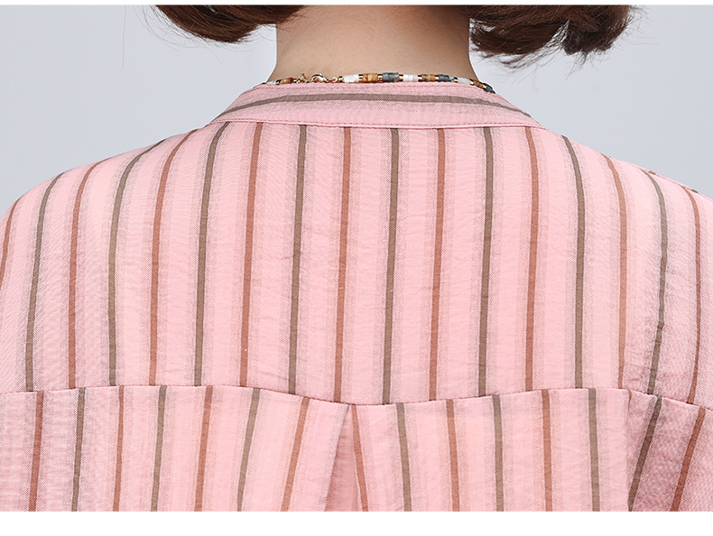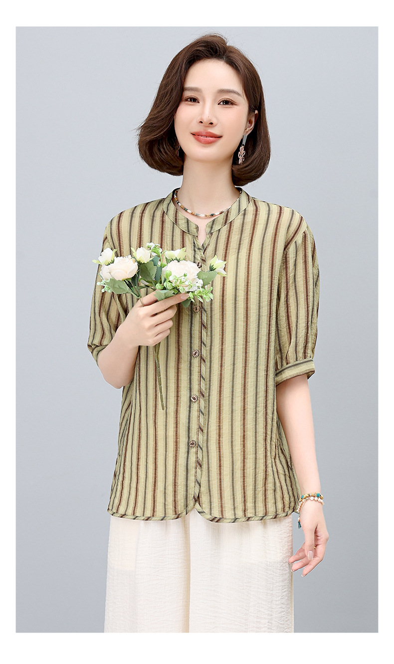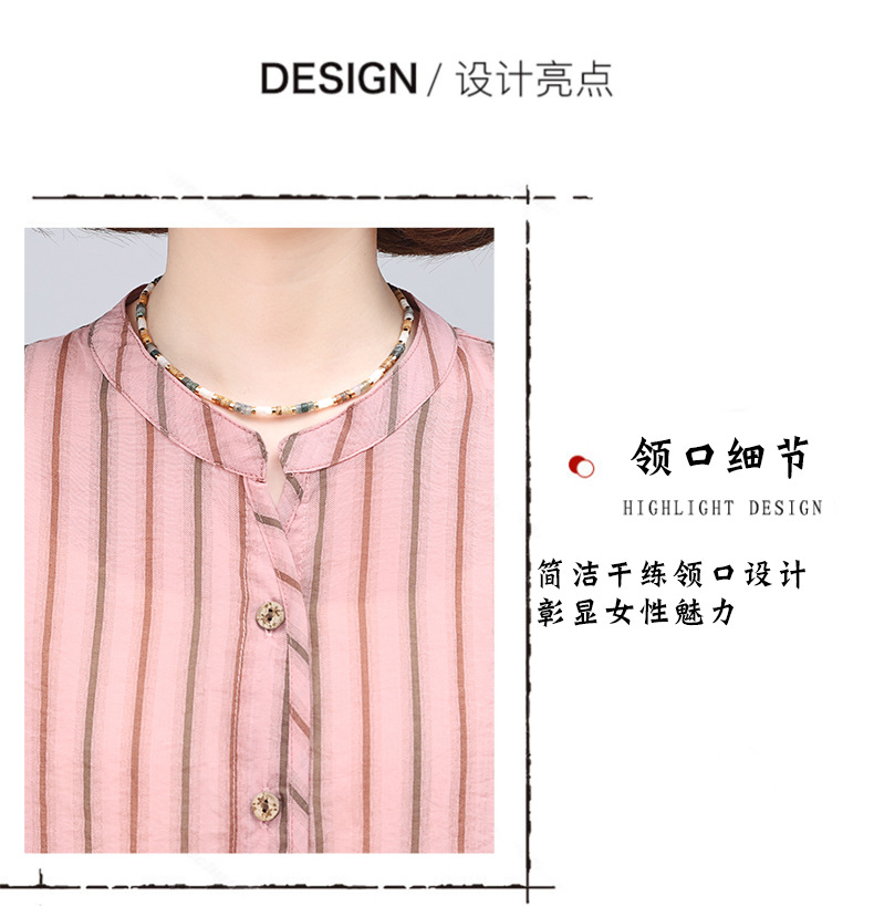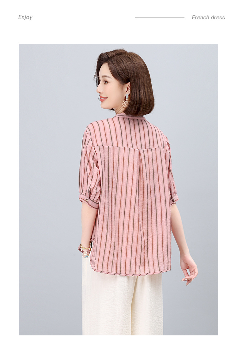 雀说条纹衬衫女短袖新款半开领文艺显瘦透气小衫薄款上衣AL5508