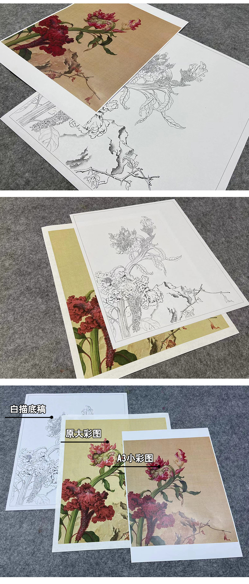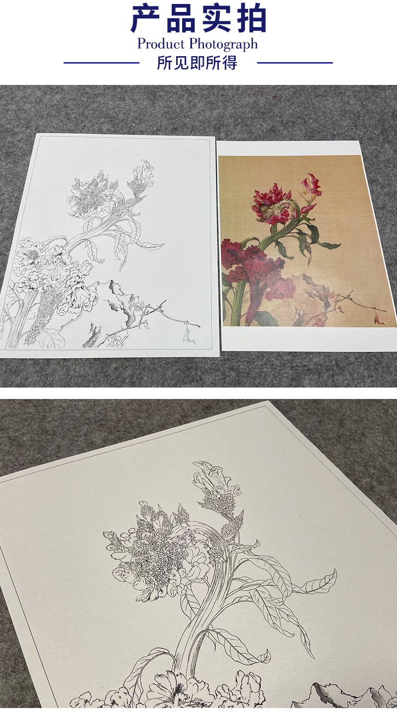 【大彩图】郎世宁工笔画白描底稿小品《仙萼长春册》鸡冠花临摹勾线花鸟线稿LT15