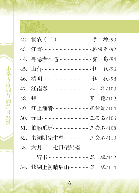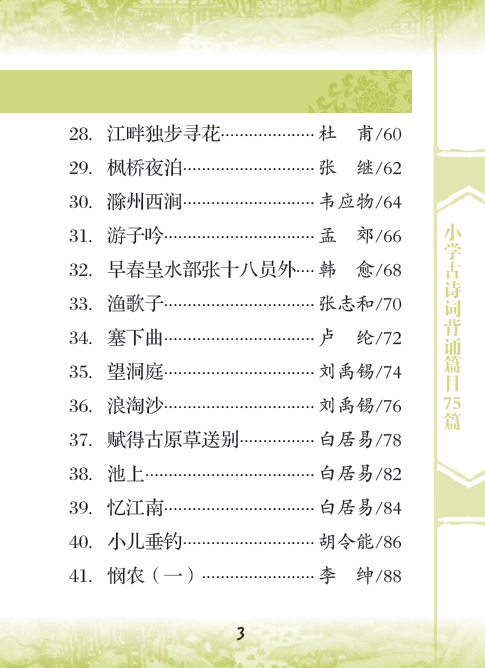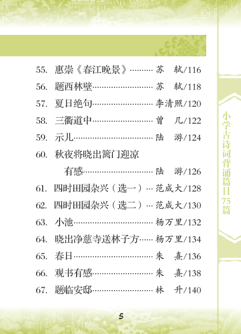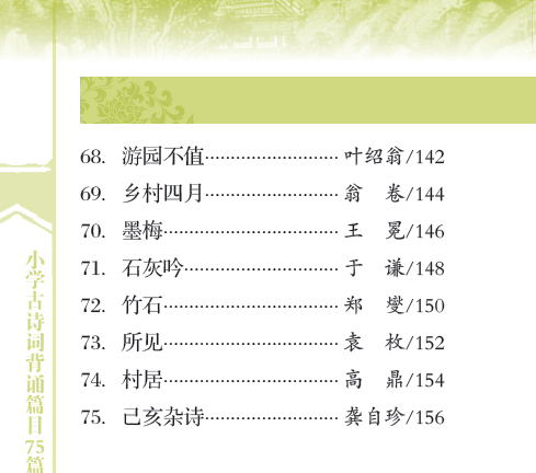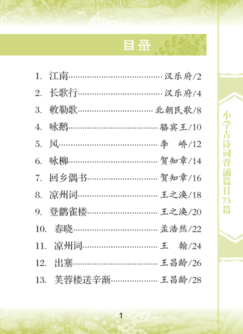 本书收集《义务教育语文课程标准》(2011年版)推荐的小学生背诵古诗词75篇,目的是方便学生随身携带,时时背诵。每一篇配以诗歌注音,便于诵读,加适量注释,帮助学生理解,文末有链接卡片,补充本篇诗歌相关知识。
