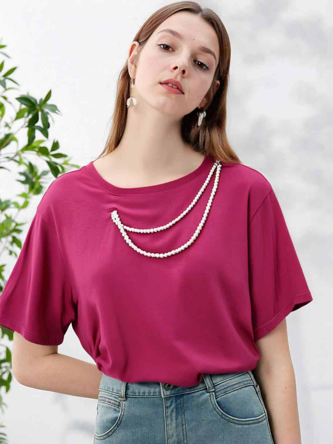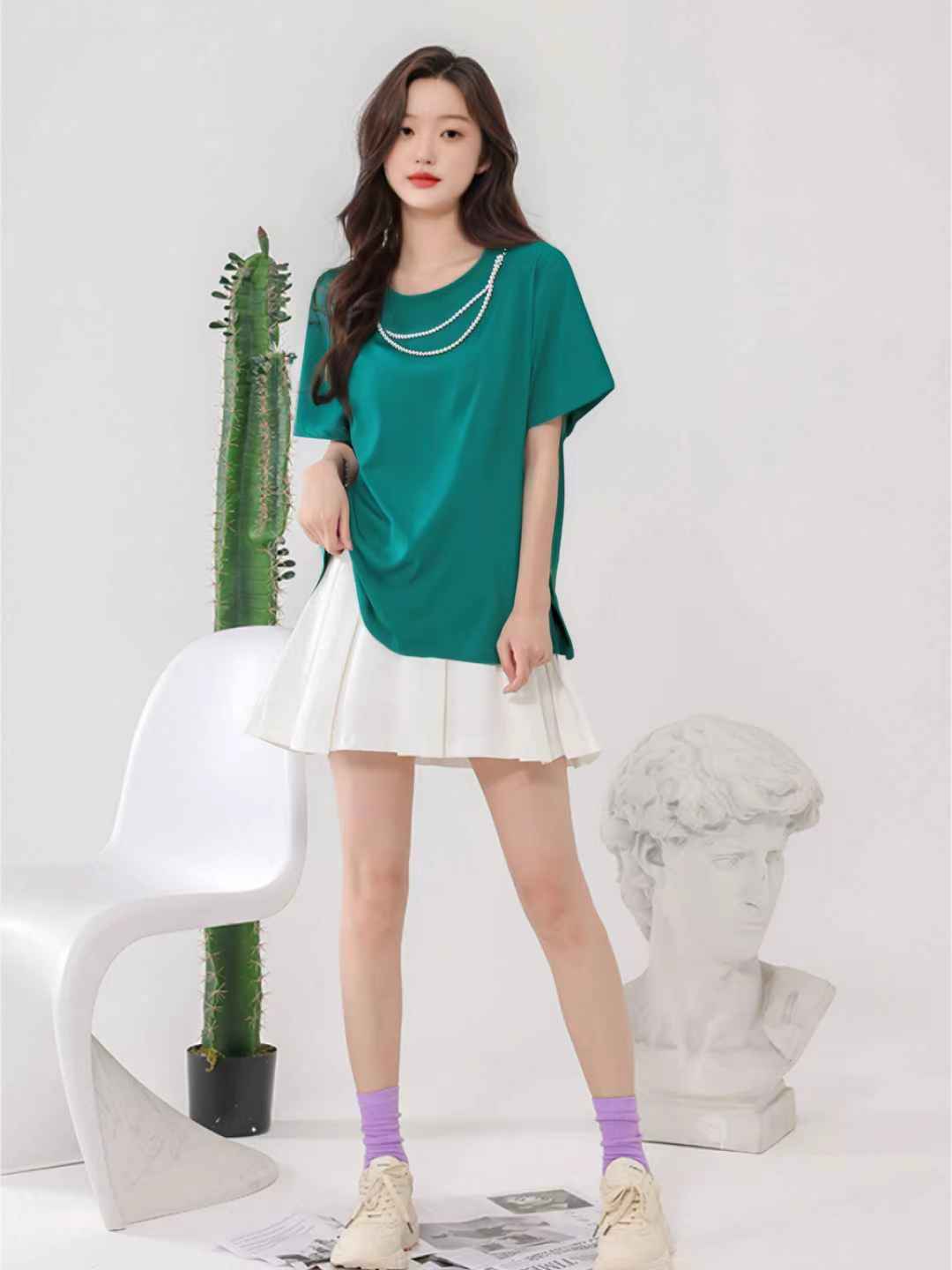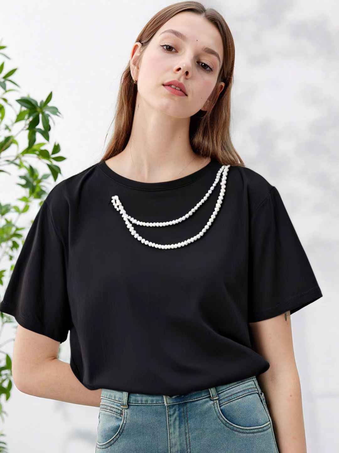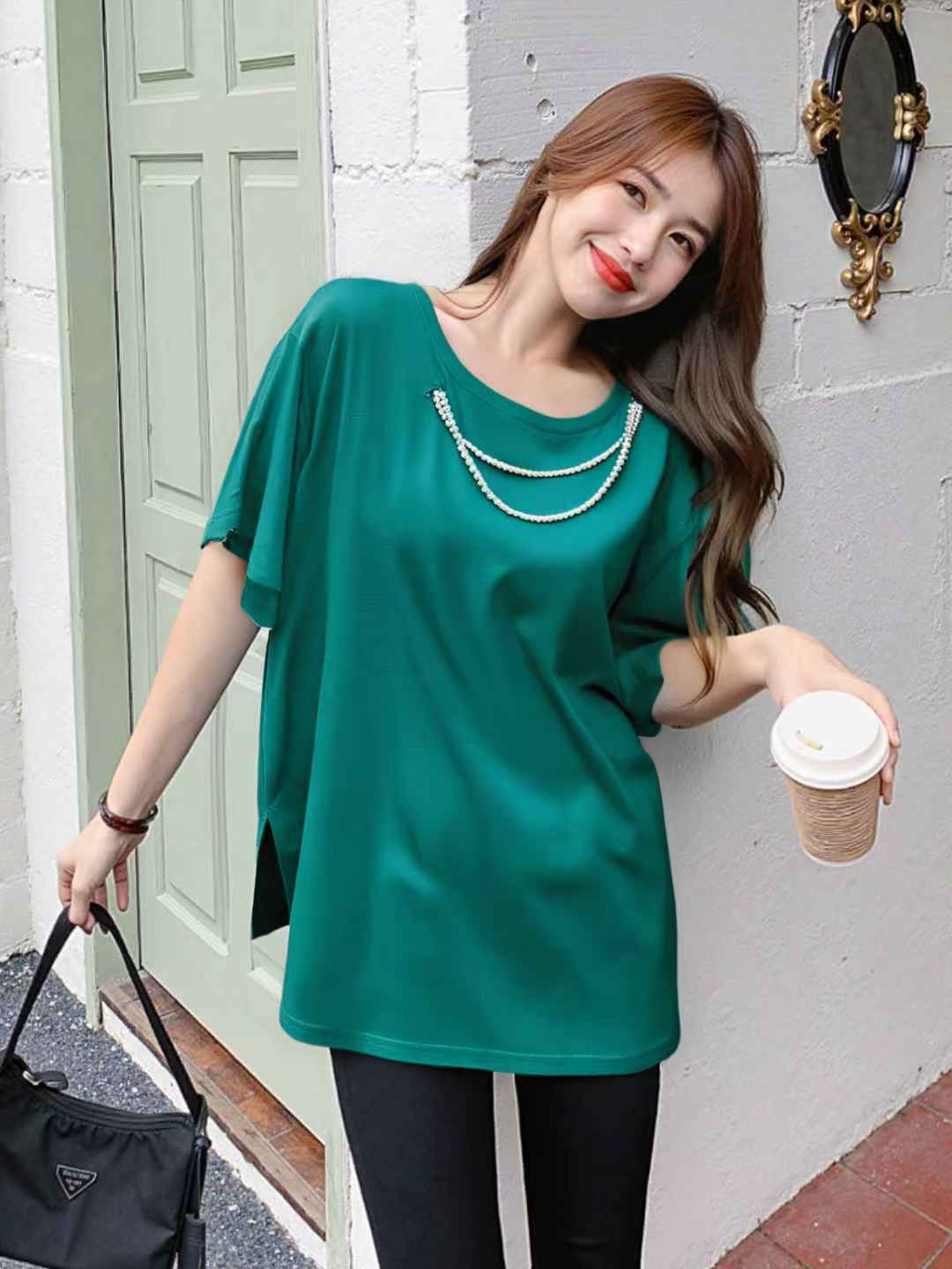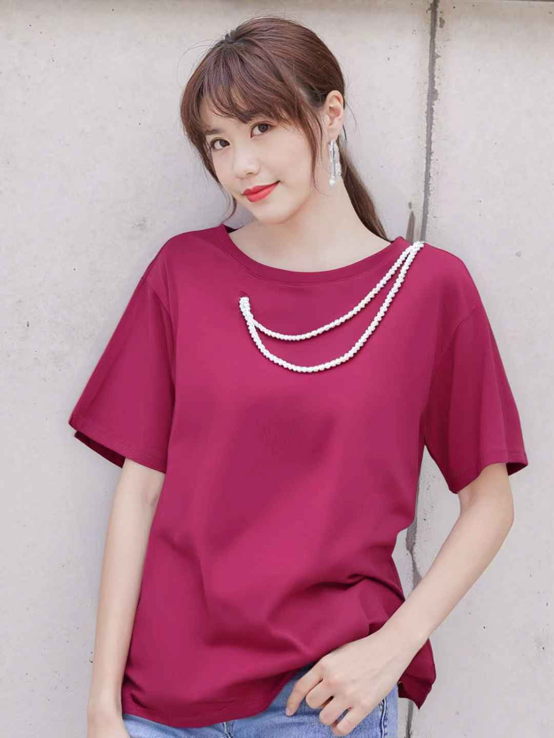 【诗铭洛可】W830珍珠链条T恤侧开叉C5-2