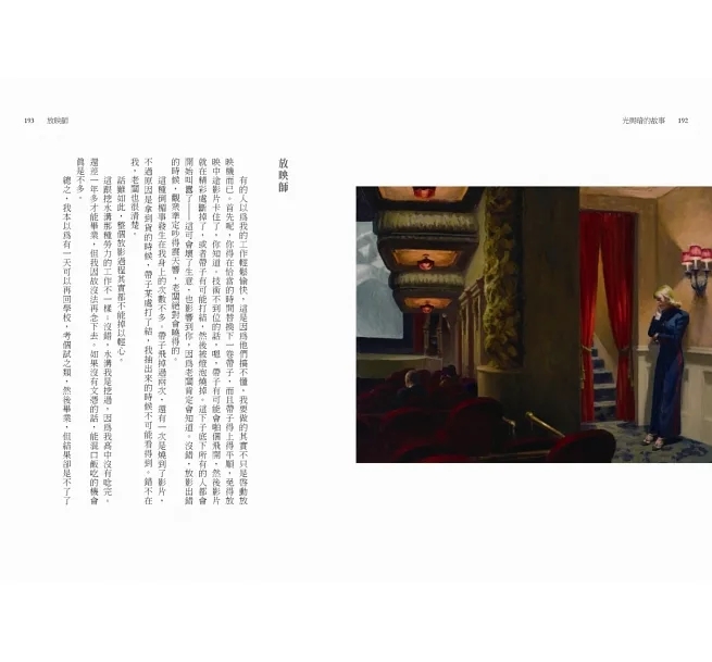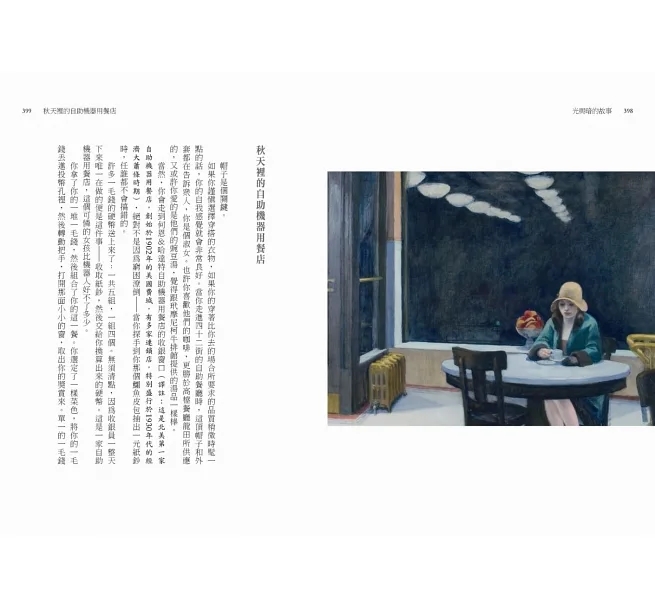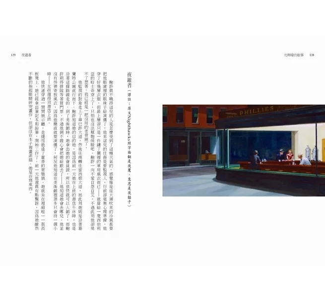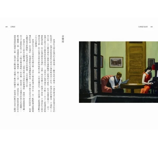 這個點子果然引起熱烈迴響,不但多位暢銷獲獎作者共襄盛舉,卜洛克自己也貢獻了一篇新作。《光與暗的故事》總共收錄十七篇小說,橫跨懸疑推理和主流文學,皆搭配不同的霍普畫作,是文字與繪畫不可思議的相遇,也是十七位熱愛霍普的小說家以美妙的巧思詮釋他畫布上的答案。
