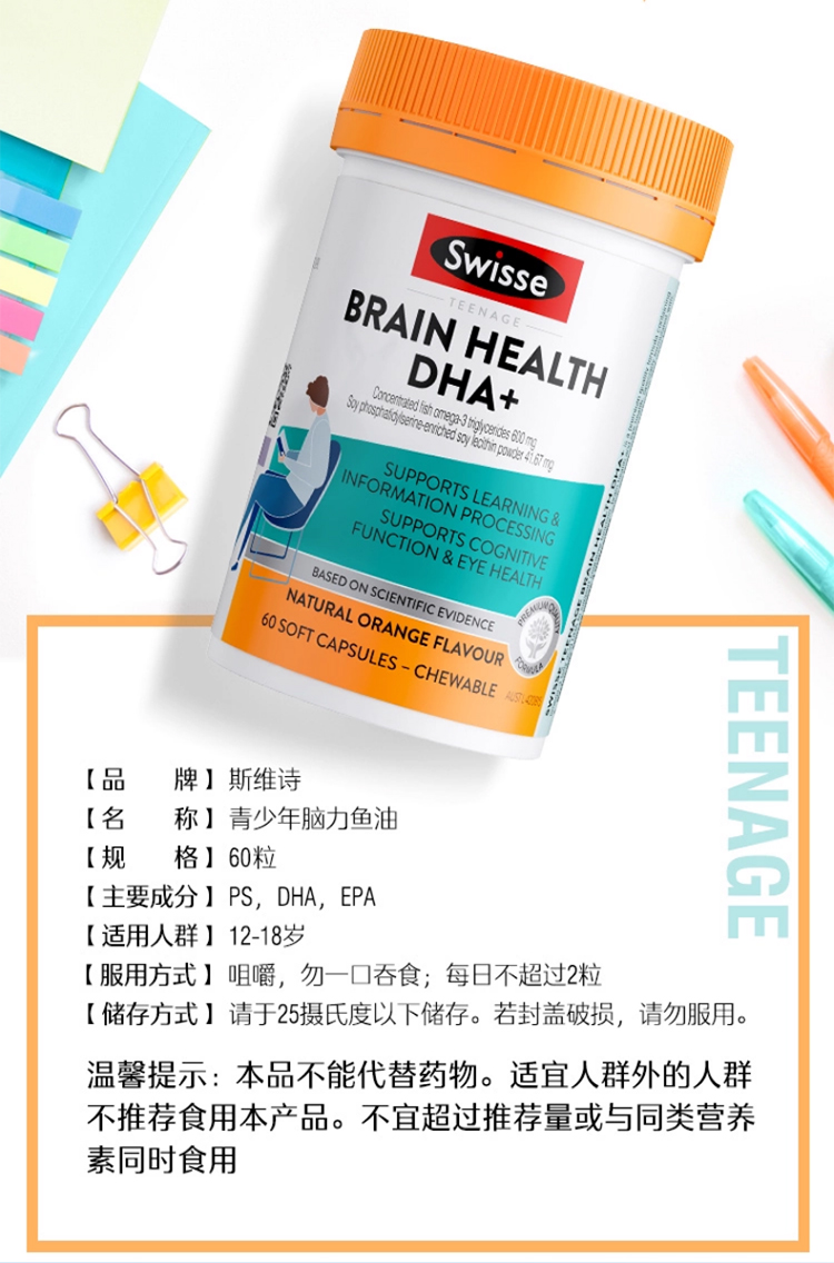 Swisse青少年脑力鱼油DHA+EPA眼脑双呵护学生备考补脑提升记忆力