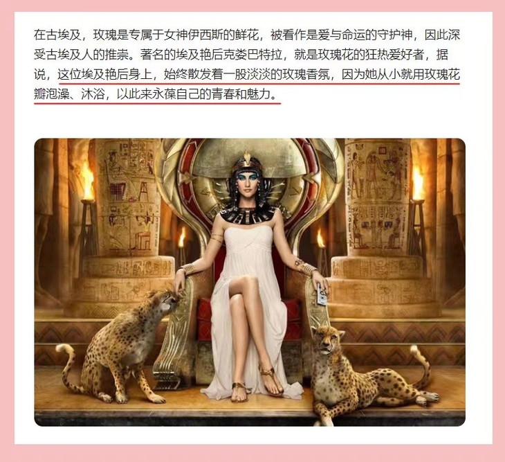 在埃及古籍中记载埃及艳后常年使用玫瑰花洗脸,沐浴 所以具有雪白的肌肤,柔软的秀发,更用玫瑰香薰捕获爱人的心!