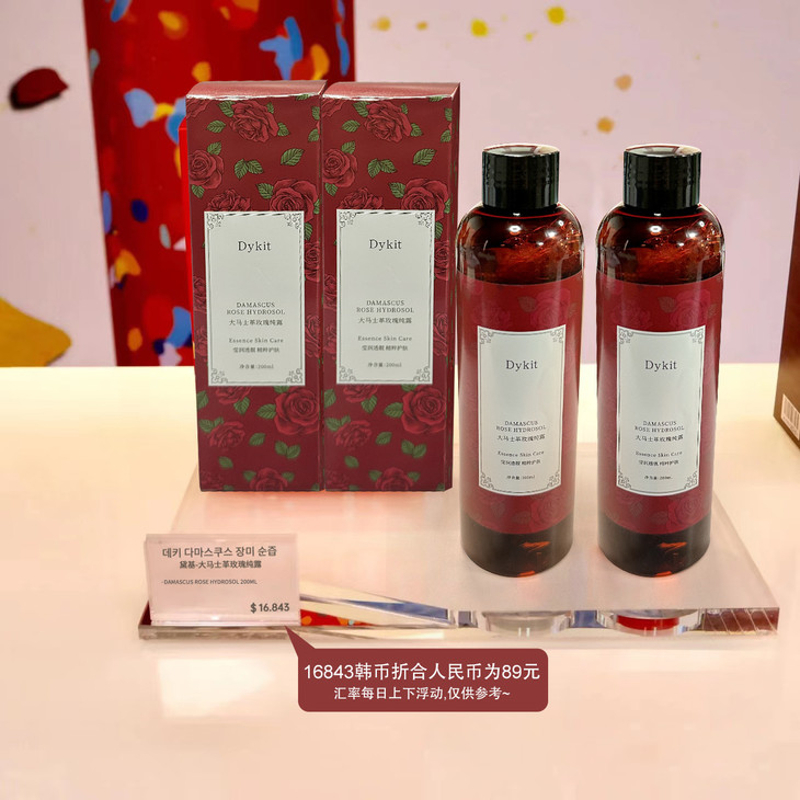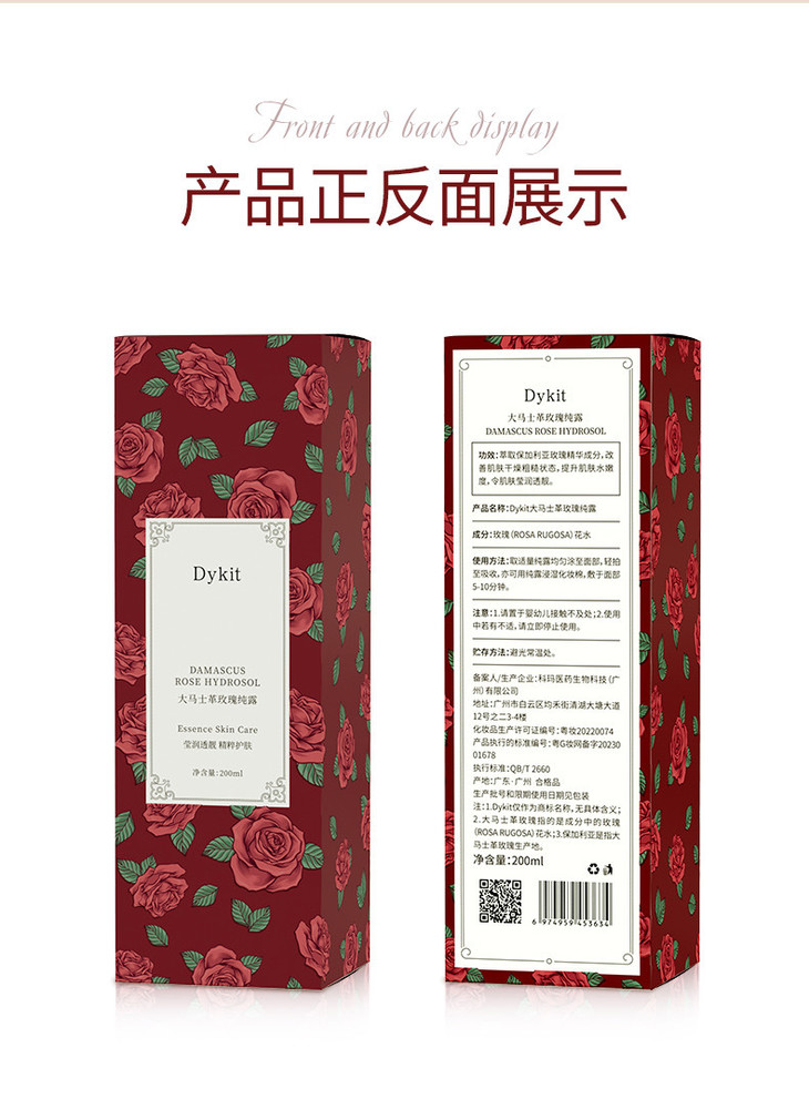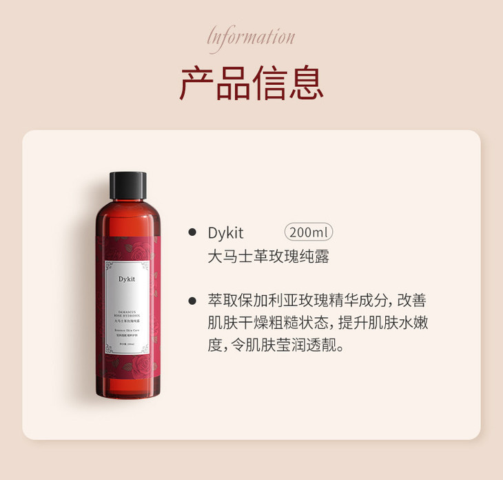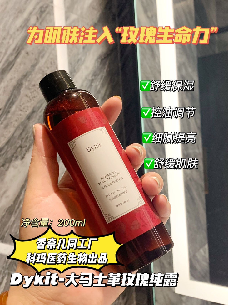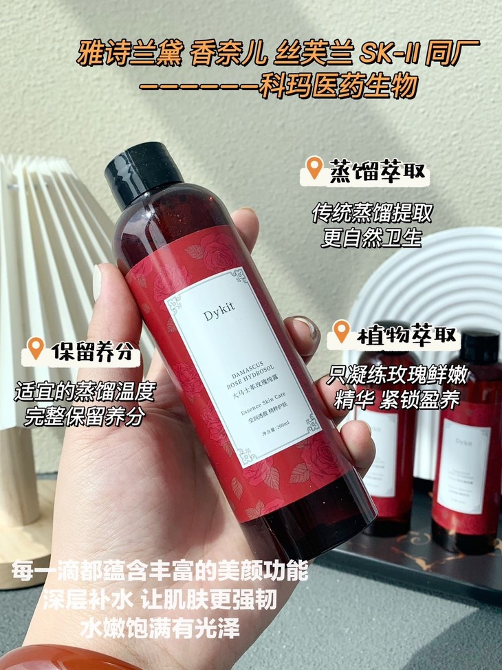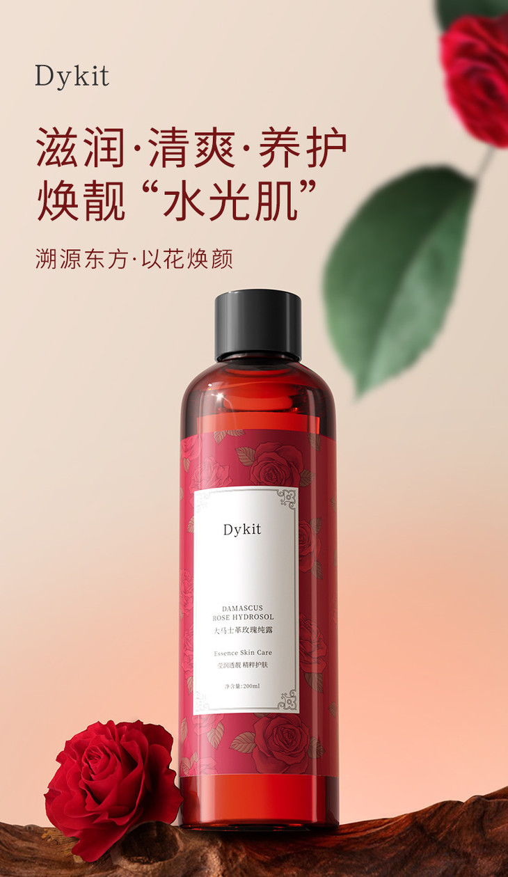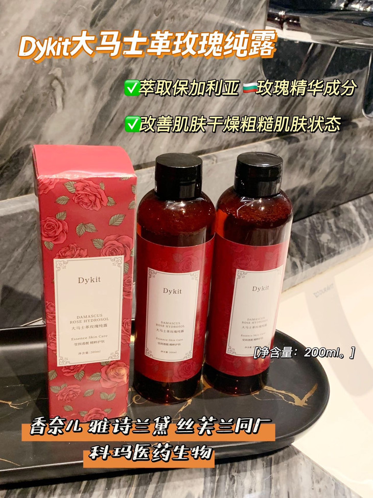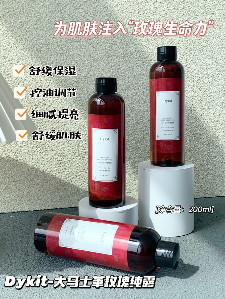Dykit-大马士革玫瑰纯露 【品牌】Dykit 【规格】200ml 【保质期】3年 【产 地】广东 · 广州 【功效】萃取保加利亚玫瑰精华成分,改善肌肤干燥粗糙状态,提升肌肤水嫩度,令肌肤莹润透靓。