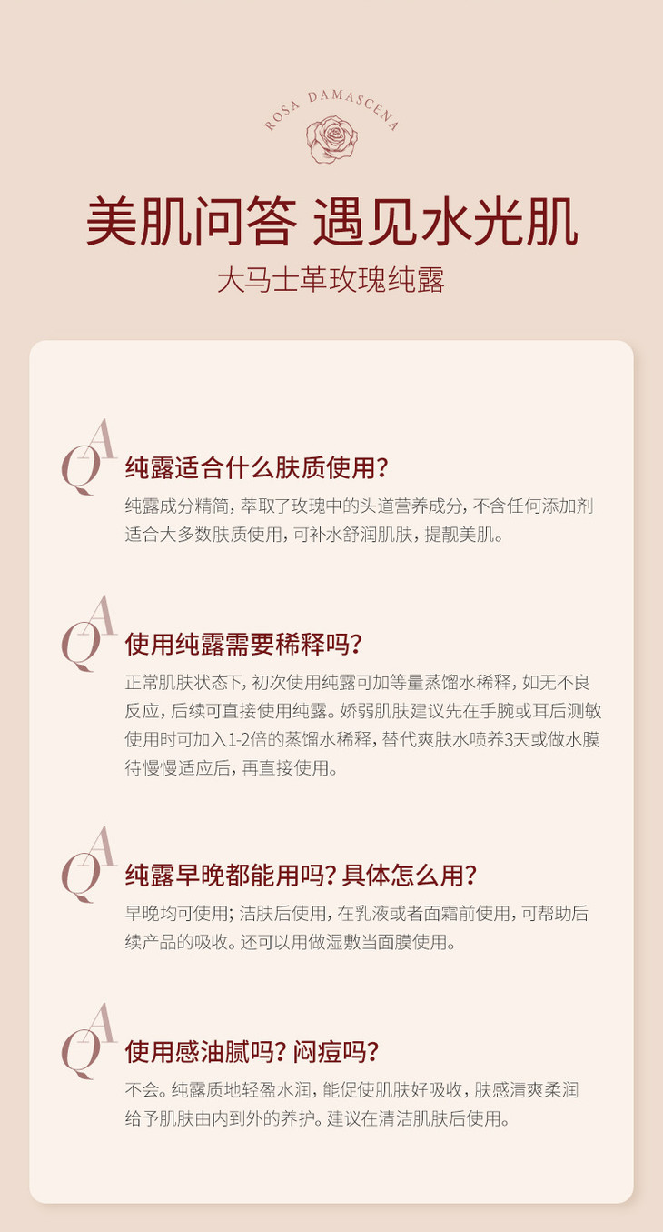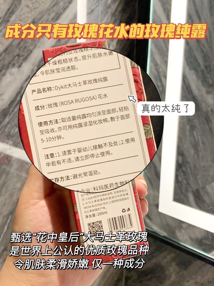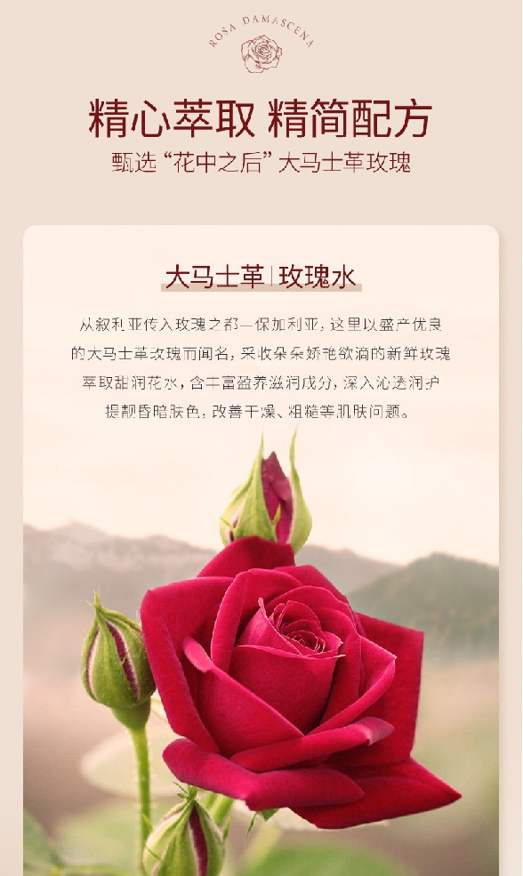 选用世界公认的优质玫瑰品种“花中皇后”👸—保加利亚大马士革玫瑰🌹 仅1⃣种成分,性质温和不刺激 不含任何添加剂及化学成分,百分百纯天然✅