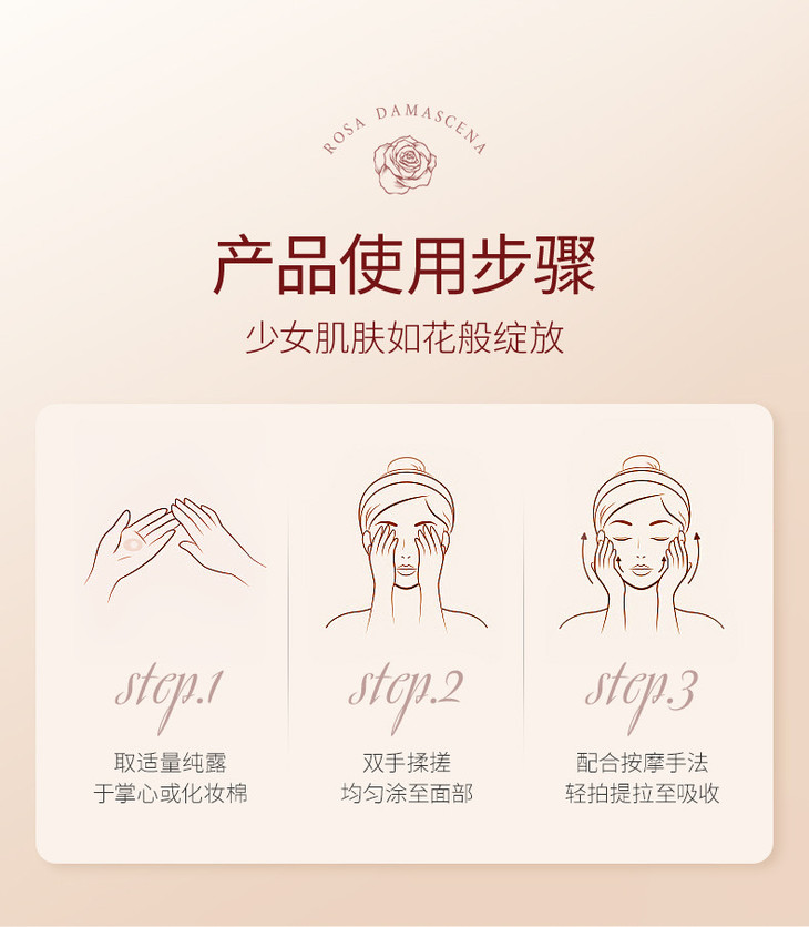 多种使用方法,随心搭配,肤质越来越细腻透靓,时刻守护嘭弹水嫩肌肤。 足足200ml的大容量,随便怎么用都不心疼!! 🉑一露多用,百搭的玫瑰纯露 解锁花样护理模式 1⃣直接轻拍-洁面后取适量纯露轻拍至吸收