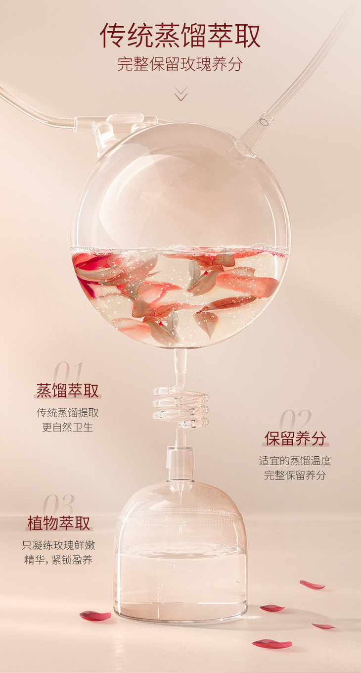 玫瑰自古就有养颜功效,这不是谣传! 玫瑰中富含的维生素C 是非常有效的抗氧化物质 还有硒、锌、铜等微量元素对抗自由基 用玫瑰纯露扫除皮肤内部自由基这个衰老因子 皮肤就能长时间维持水润透亮的模样! 玫瑰还有非常强大的保湿和锁水作用💦 对于干燥肌肤,玫瑰会促进皮脂腺分泌 因干燥出现的干纹、细纹,它都能帮忙淡化 配合抑菌的效果,皮肤自然会达到细腻光泽的状态!