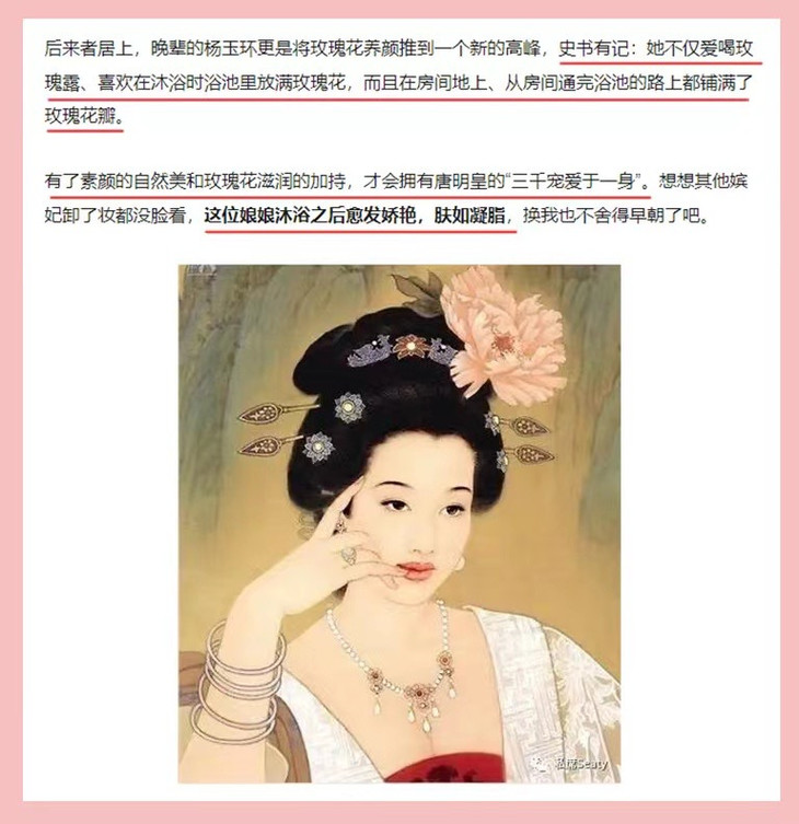 中国古代杨玉环从小就钟情于玫瑰护肤 正是常年的玫瑰滋养和呵护 杨玉环才能拥有白透无暇的玉肌! 而现在随着科学的进步 我们已经能更简便的使用到玫瑰🌹 收获更有效的护肤效果!