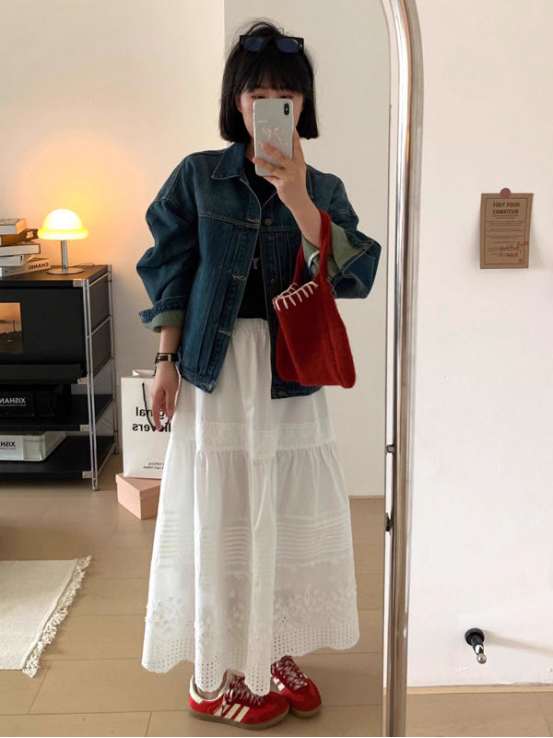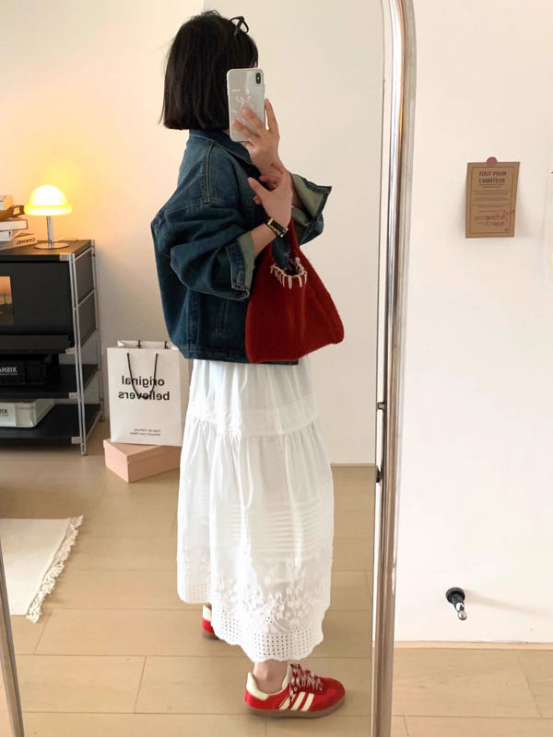 这款半裙采用A字版型设计 既保留了复古的优雅感,又兼顾了现代女性对舒适度的追求 裙摆自然贴合身形,不会显得过于夸张,适合各种身材的女生