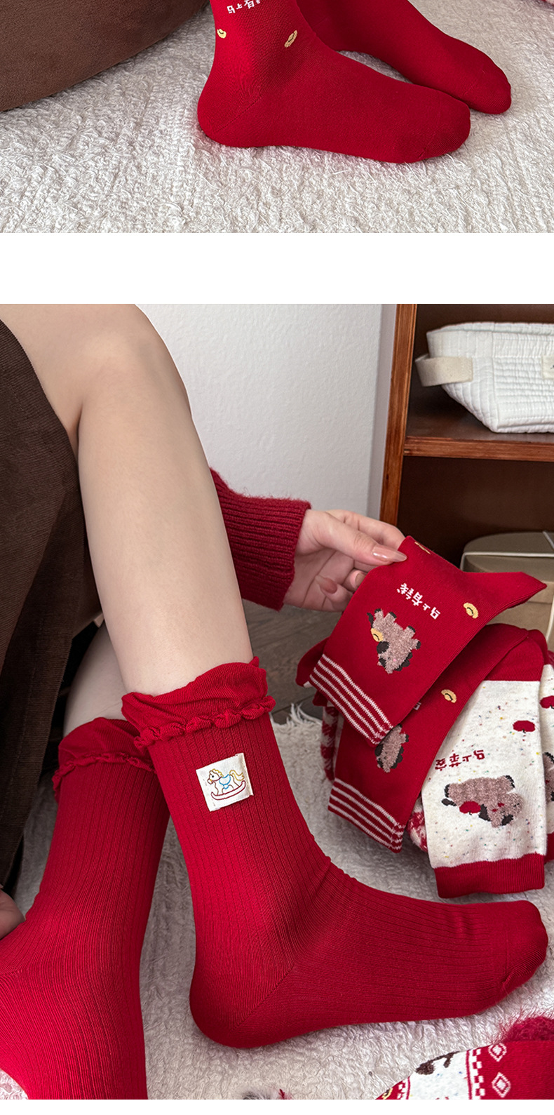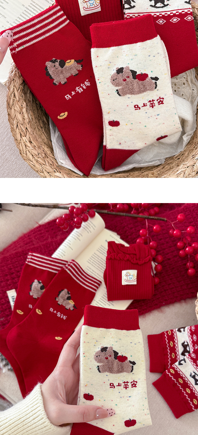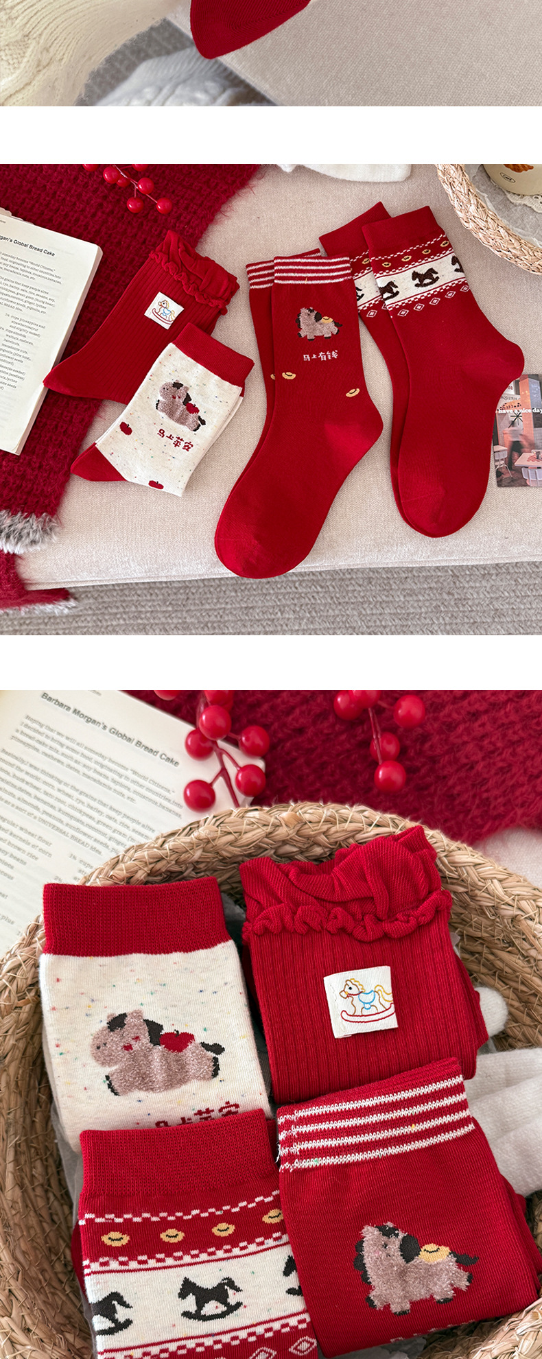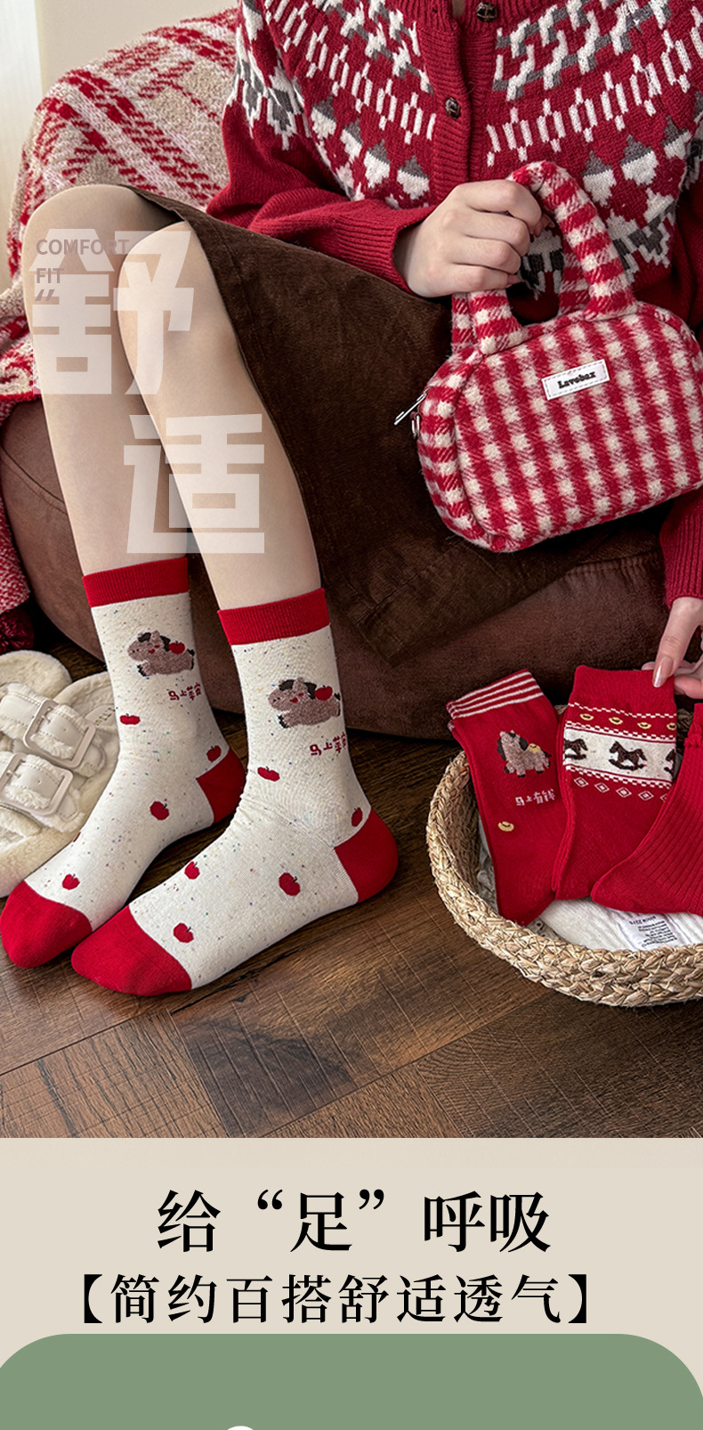 【YW】无忧购【鸿运当‘红’】4条装本命年红袜子女中筒袜秋冬季款棉袜ins潮马年新年礼物可爱长筒袜(截单后3-5天发货)