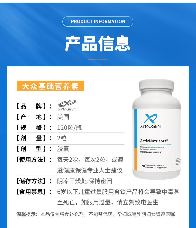 【效期至27年4月】大众基础营养素 XYMOGEN ActivNutrients 120粒/瓶