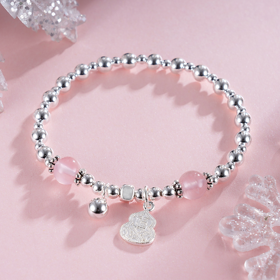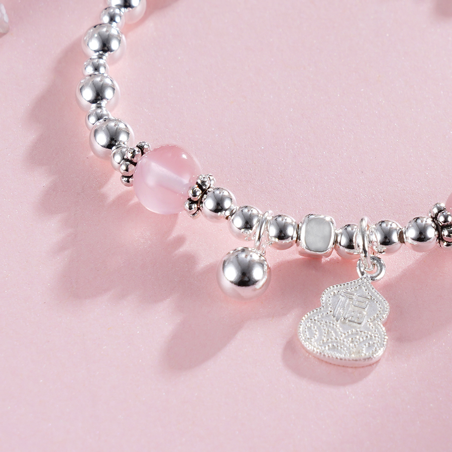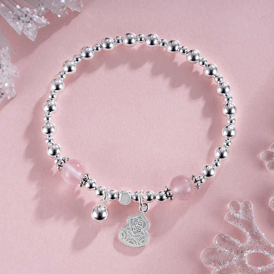 【寓意】:纯银粉水晶手串,色泽淡雅,娇艳欲滴。融入葫芦元素,不仅适宜跨年佩戴,亦能日常吸引桃花、招纳吉祥。