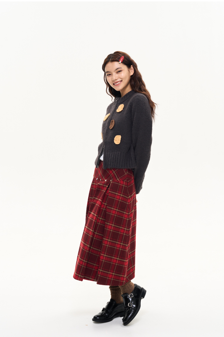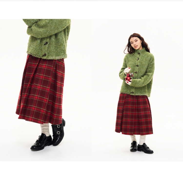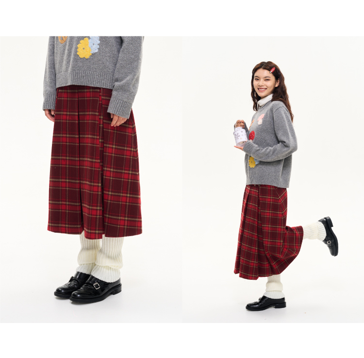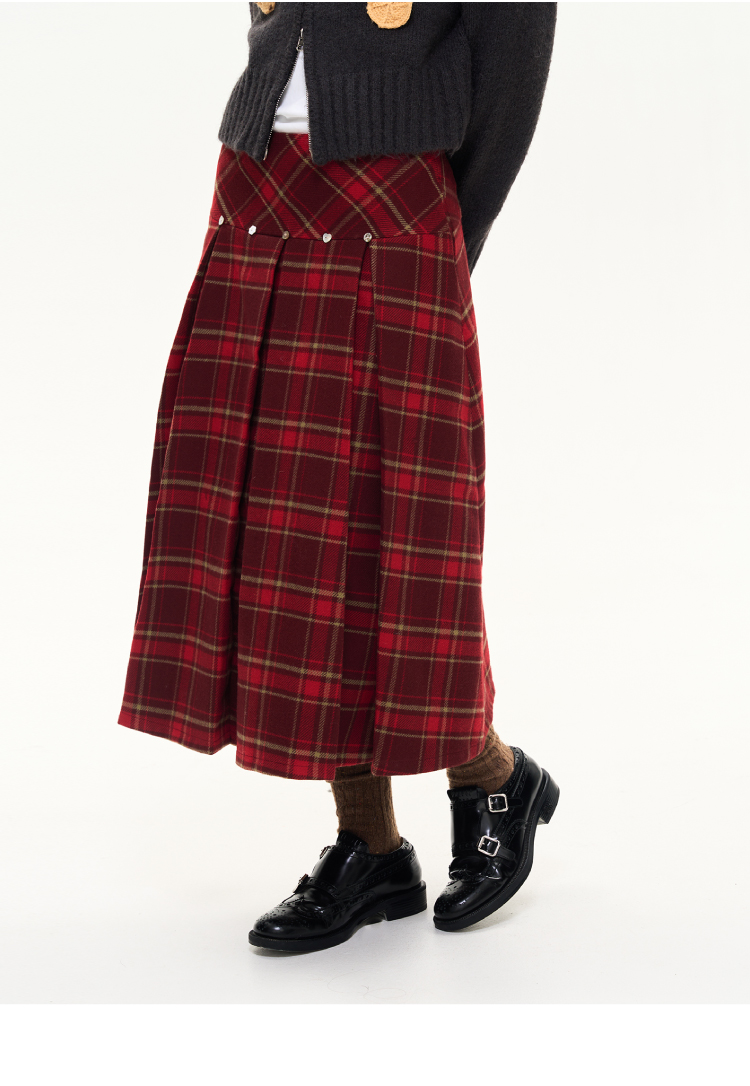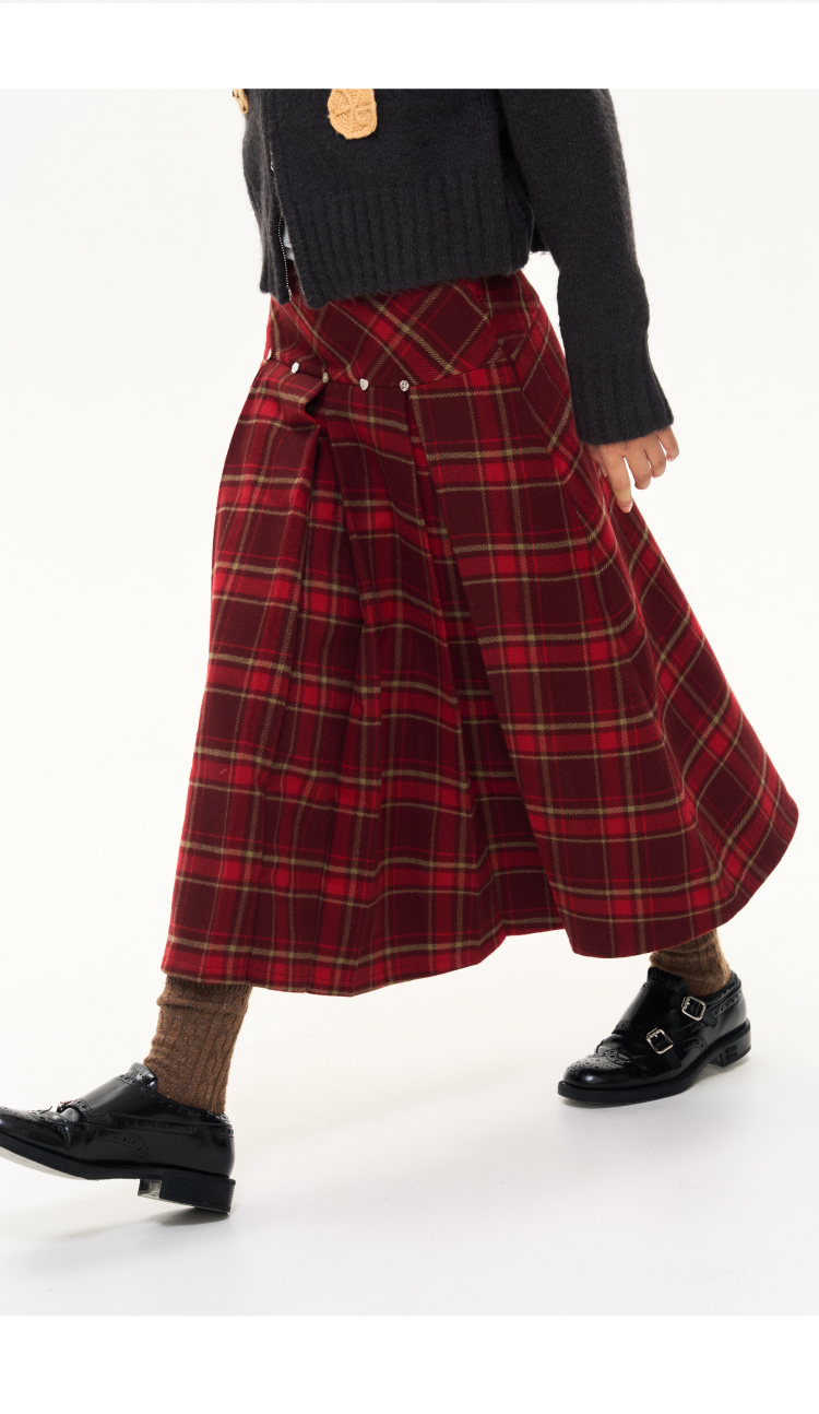 heris/H44109/节日红色格纹 贝壳扣装饰 毛呢百褶半裙