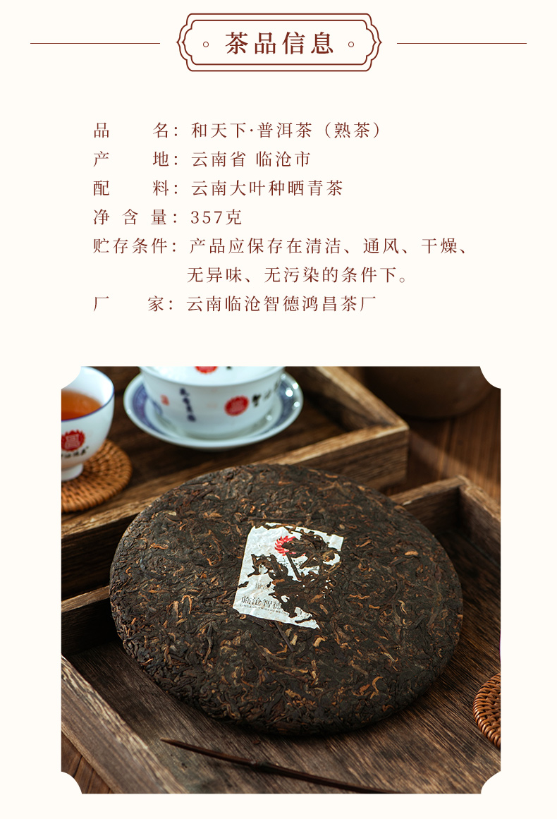 云南临沧智德鸿昌2501【和天下】普洱茶熟茶357g/饼