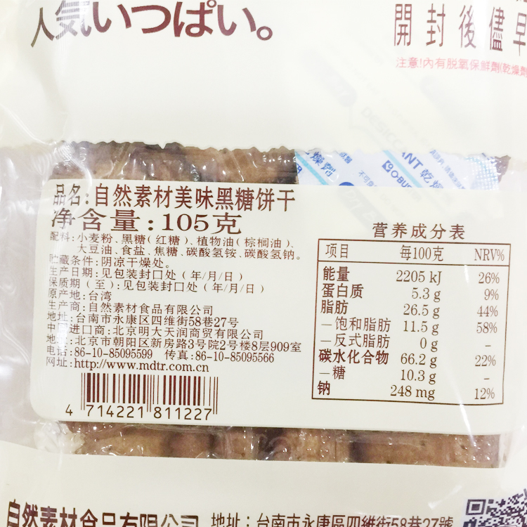 自然素材美味黑糖饼干 净含量:105克 配料:小麦粉,黑糖(红糖),植物油(棕榈油),大豆油,食盐,焦糖,碳酸氢铵。 贮藏条件:阴凉干燥处。 |