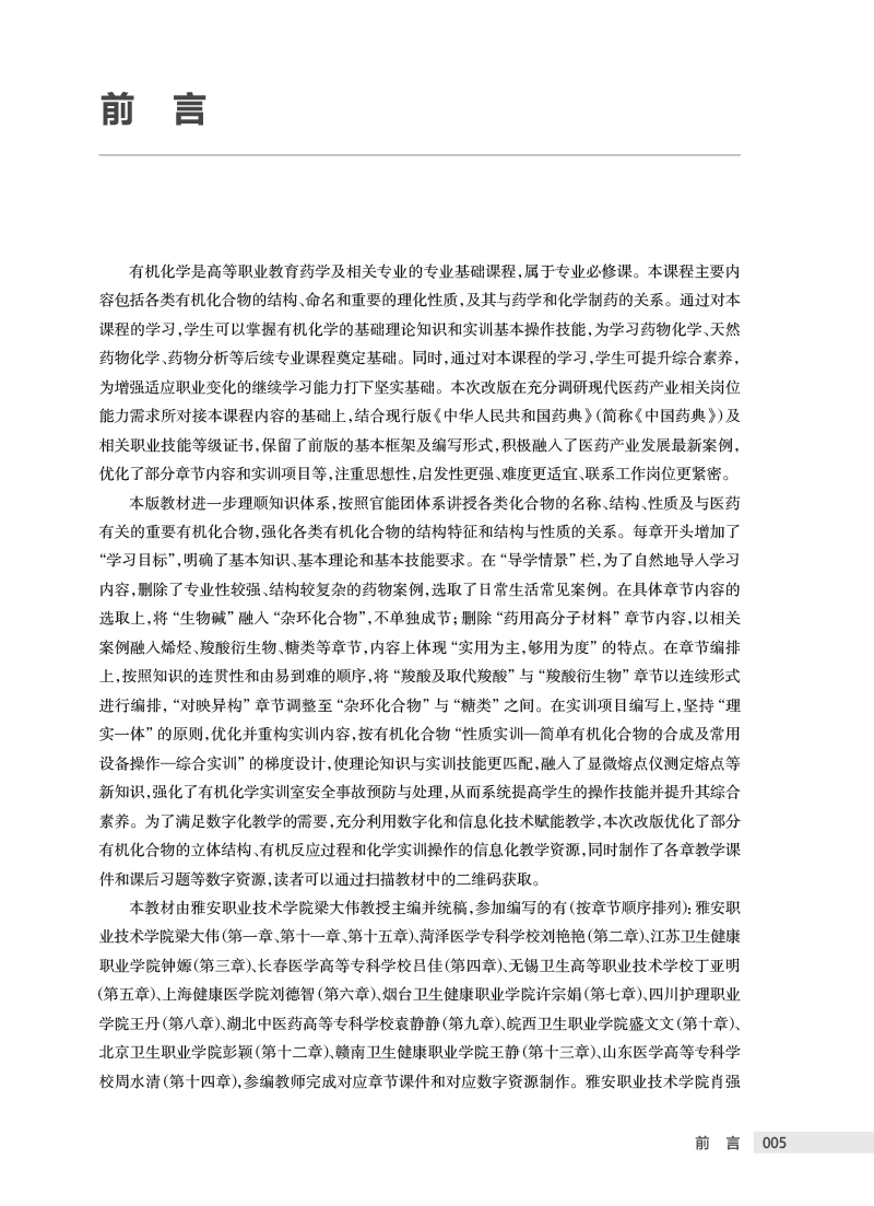 本次修订的重点:一是内容上要传承创新,同时根据新出台的国家政策法规、《中国药典》等对教材进行更新,并解决职业教育聚焦的新问题,以保证教材内容的先进性;二是继续坚持“三基”“五性”“三特定”的原则,进一步优化主体框架设计,做到固基础,打破升学“天花板”,强实践,传承技术技能,培养大国工匠;三是丰富栏目模块,切实做到课证融合;四是体现理实一体,提高学生实践能力;五是优化版式设计,兼容不同学时需求,可以尝试活页式教材编写;同时将思想政治教育润物细无声地融入教材,激发学生的爱国主义情怀以及大国工匠精神。 在提高可读性方面采取以下措施:一是根据各门课程的特点,采用案例导入、问题引领等编写方式,使教材更加生动且更贴合岗位实际,增加学生的学习兴趣;二是多配图表,形象直观,便于教师讲授与学生理解;三是采用纸质教材为载体的融合教材形式,运用二维码技术将教学需要的补充内容做成数字资源,形成线上线下的多维学习模式。