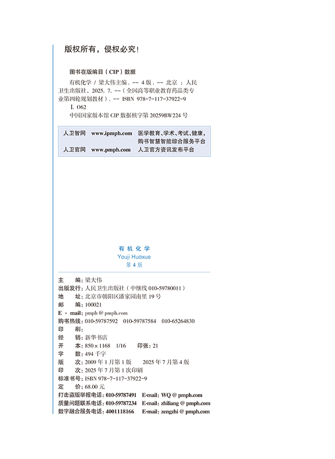 有机化学 第4四版 十四五规划教材全国高等职业教育药品类专业第四轮规划教材 梁大伟 供药学类食品类等相关专业用 人民卫生出版社