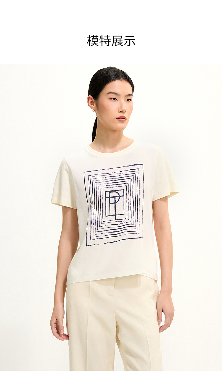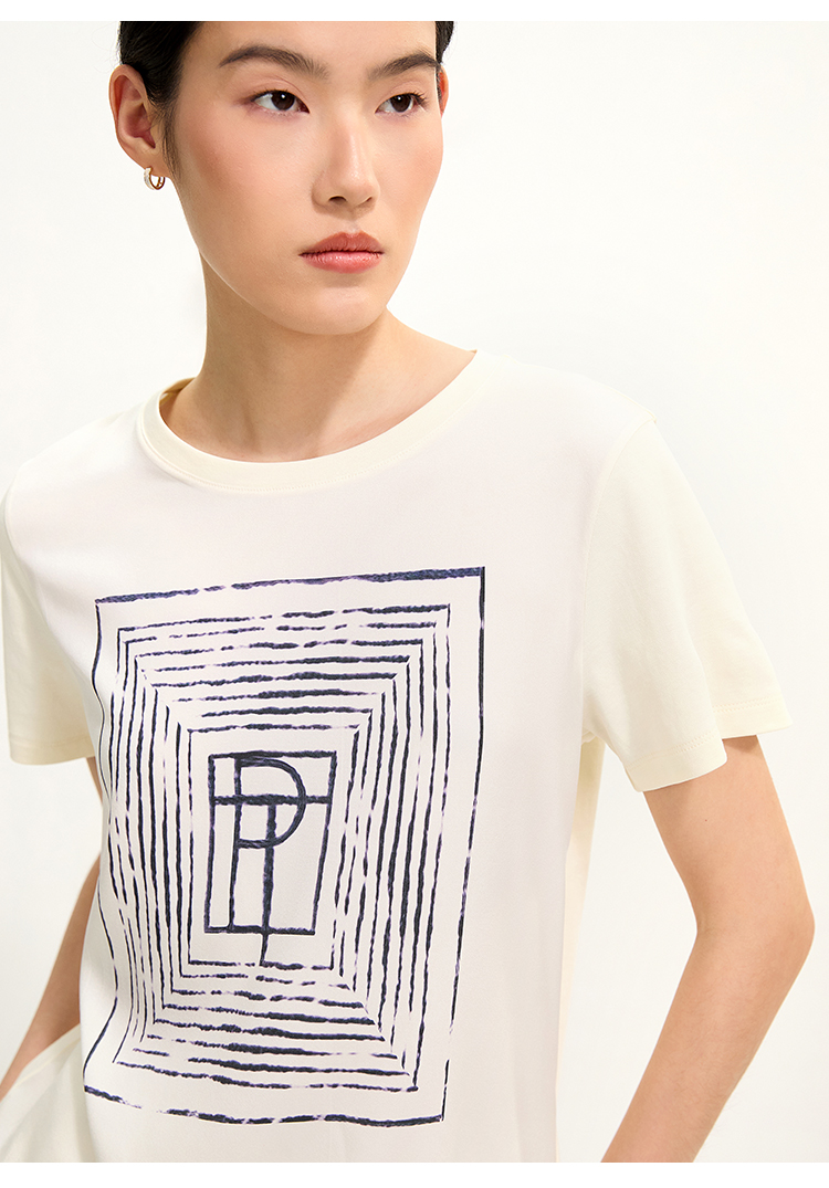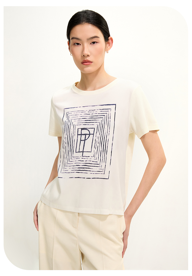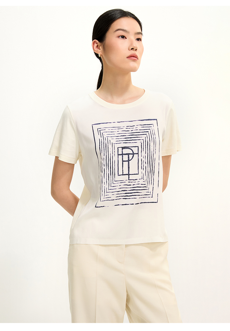 PURE TOUCH米白色简约几何图案圆领T恤 1304252131