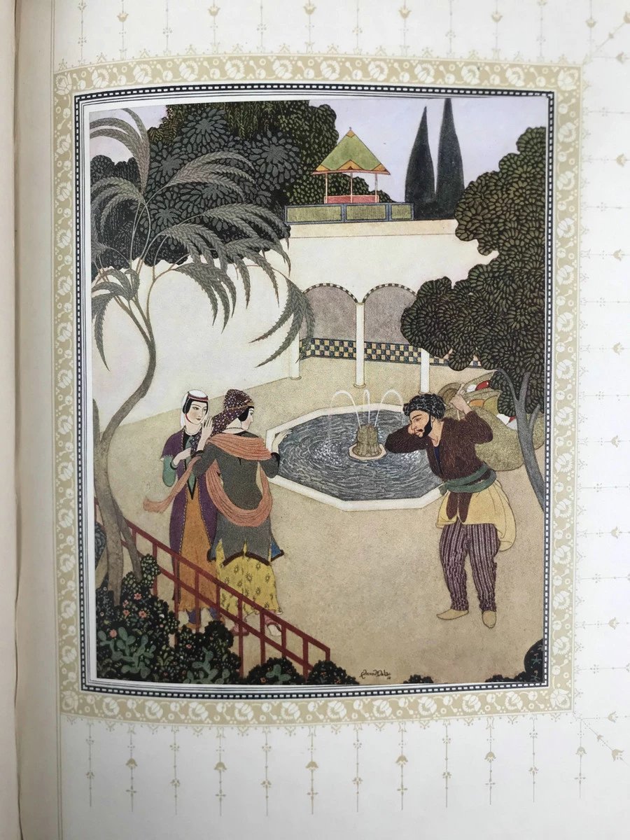 桑格斯基和萨特克利夫装帧工坊,1901年成立于伦敦,是20世纪最重要的装帧工坊之一,以其用货真价实的黄金珠宝装饰的封面而闻名。这家工坊由Francis Sangorski(1875-1912)和George Sutcliffe(1878-1943)创立,两人在伦敦中央工艺美术学院结识,师承装帧大师道格拉斯·科克雷尔。他们联手制作的《鲁拜集》封面饰有华丽无双的孔雀烫金纹饰,全书烫有一百平方英尺的金叶脉络,拼接嵌入四千九百六十七块各种颜色的羊皮,镶嵌一千零五百颗各种宝石,被誉为图书装帧史上奢华之最,可惜这本书1912年随泰坦尼克号一起沉入了海底,这本书在后世的书籍装帧文化中产生了深远的影响。