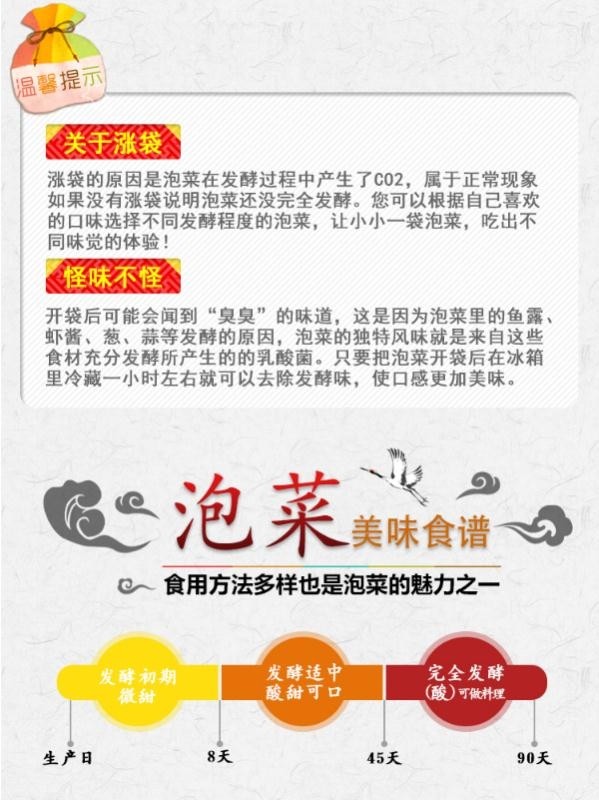 【温馨提示】亲~因泡菜运输过程不能完全确保0-4摄氏度的冷藏环境,均将产生不同程度的涨袋儿哦!~涨袋是泡菜发酵所致,属正常现象,发酵所产生的益生菌亦对身体有益,可以食用哦~如发酵后口感酸,您不喜食,可尝试制作泡菜饼、泡菜汤、泡菜五花肉等传统韩国美食,切勿任性丢弃导致浪费哦~望您知悉!介意者勿拍!!