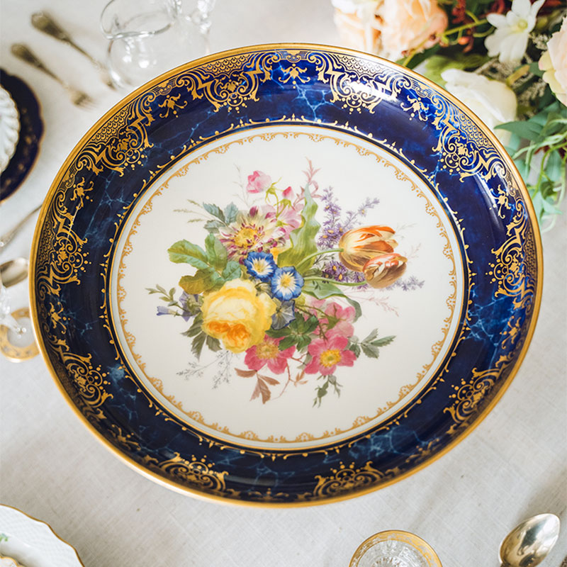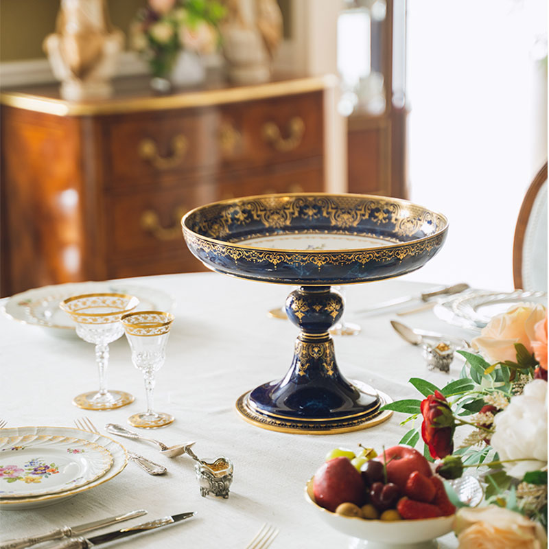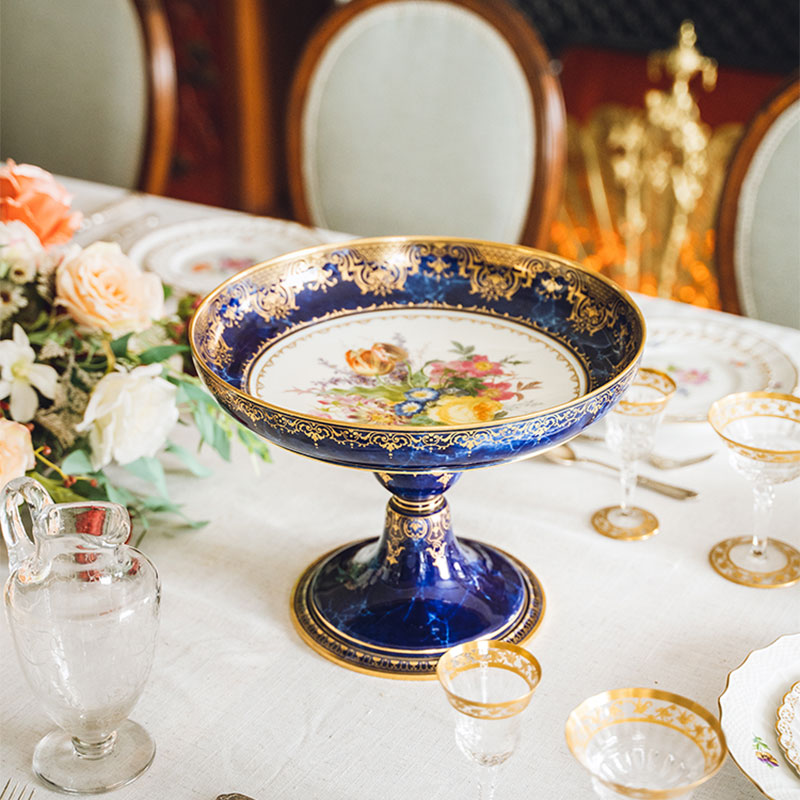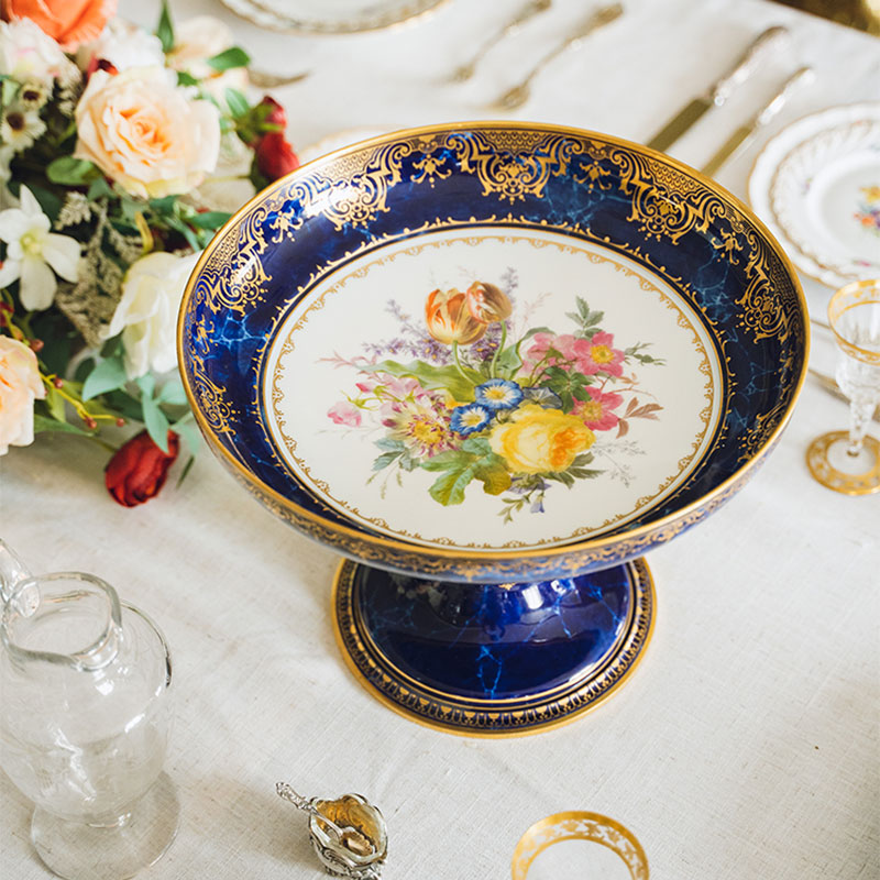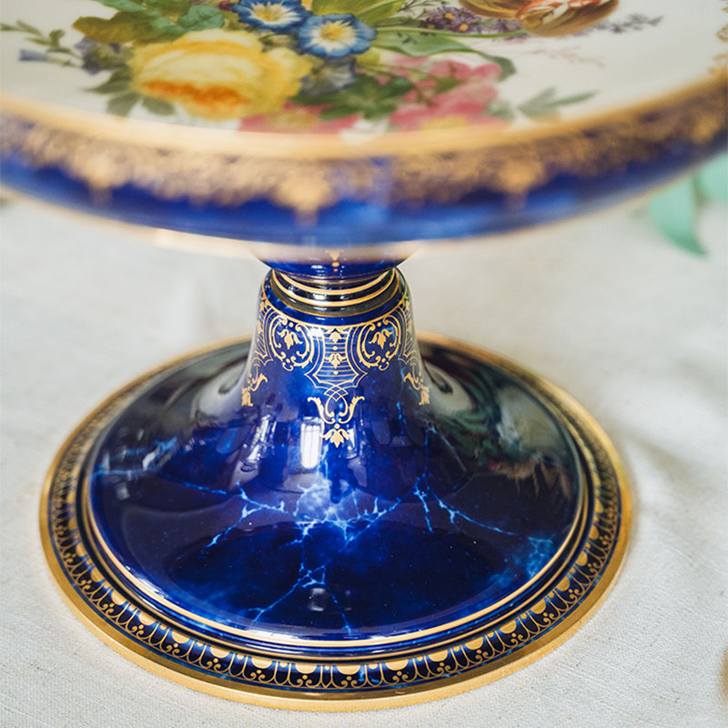 1873年代法国出品闪电蓝釉描金彩绘花卉主题果樽