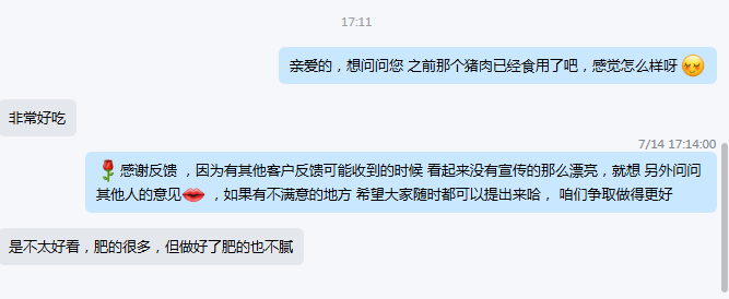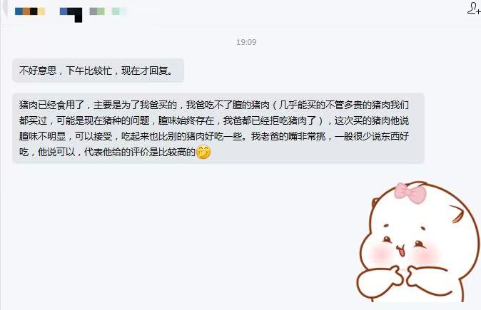 熟食猪肉的肥膘要比普通猪肉厚,加上我们的猪肉喂养时间都是一年以上,虽然看着会更肥一些,但这个猪肉肥的部分香味会比一般的猪肉的香很多,介意的喵慎拍哦~