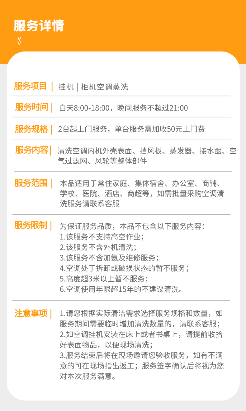 3. 上门清洗台数需≥2台,单台服务需加收50元上门费。