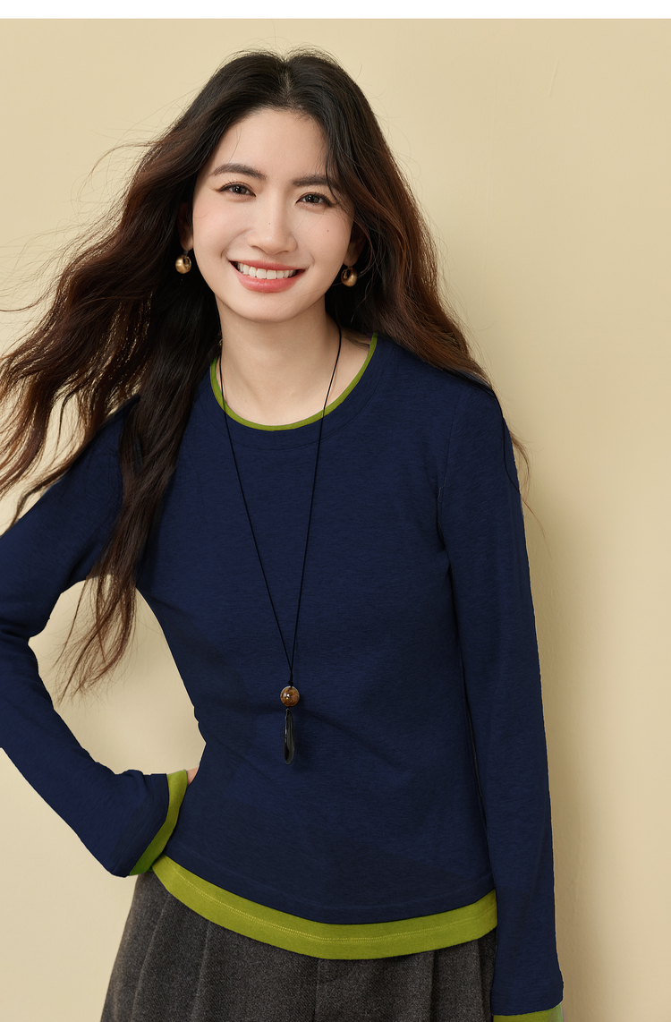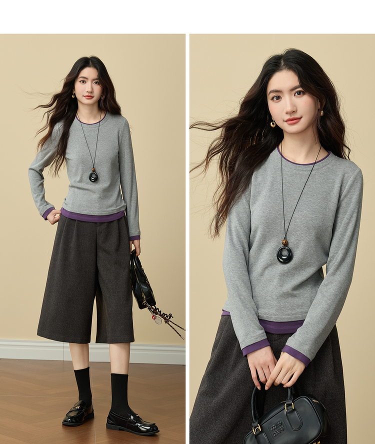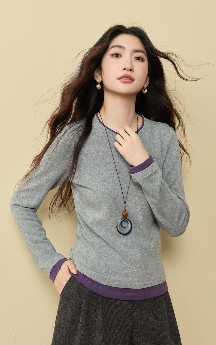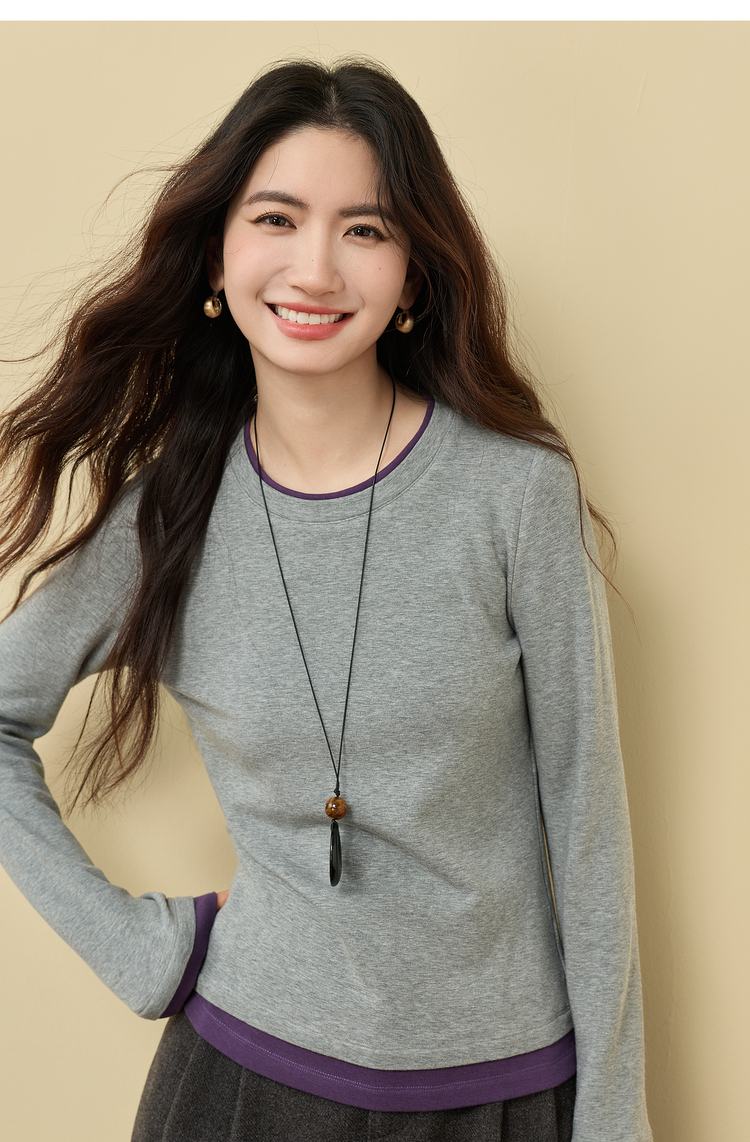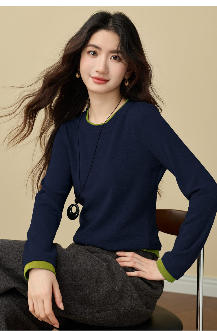 【12/03新品】熙世界撞色假两件抓毛T恤女长袖修身收腰圆领上衣打底衫2025秋冬