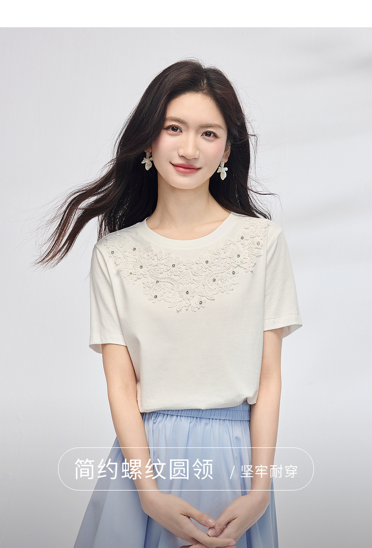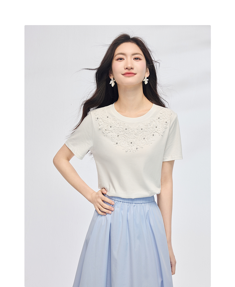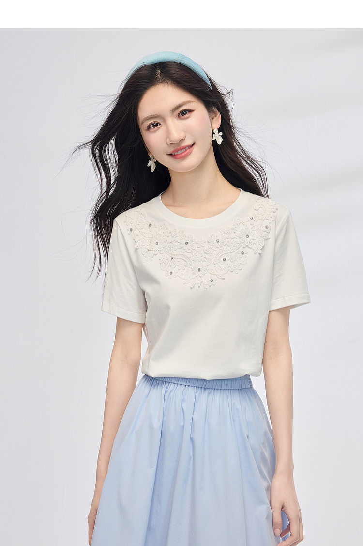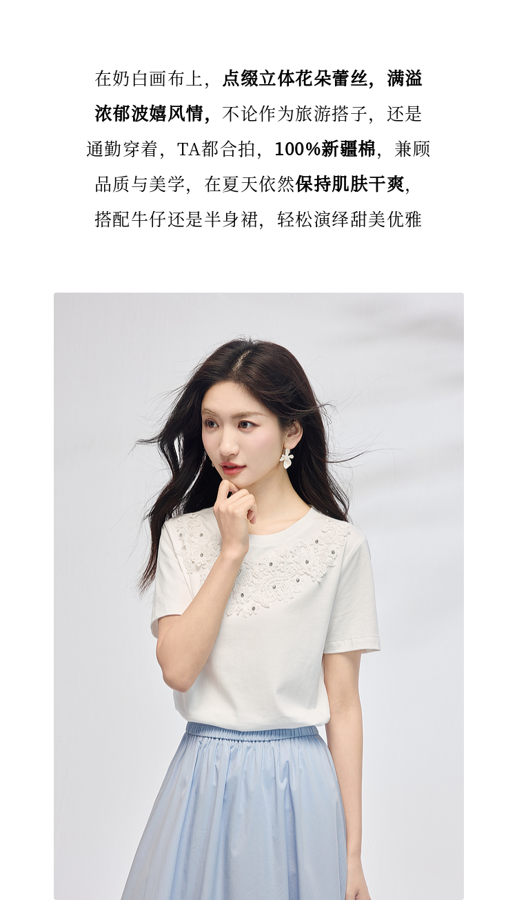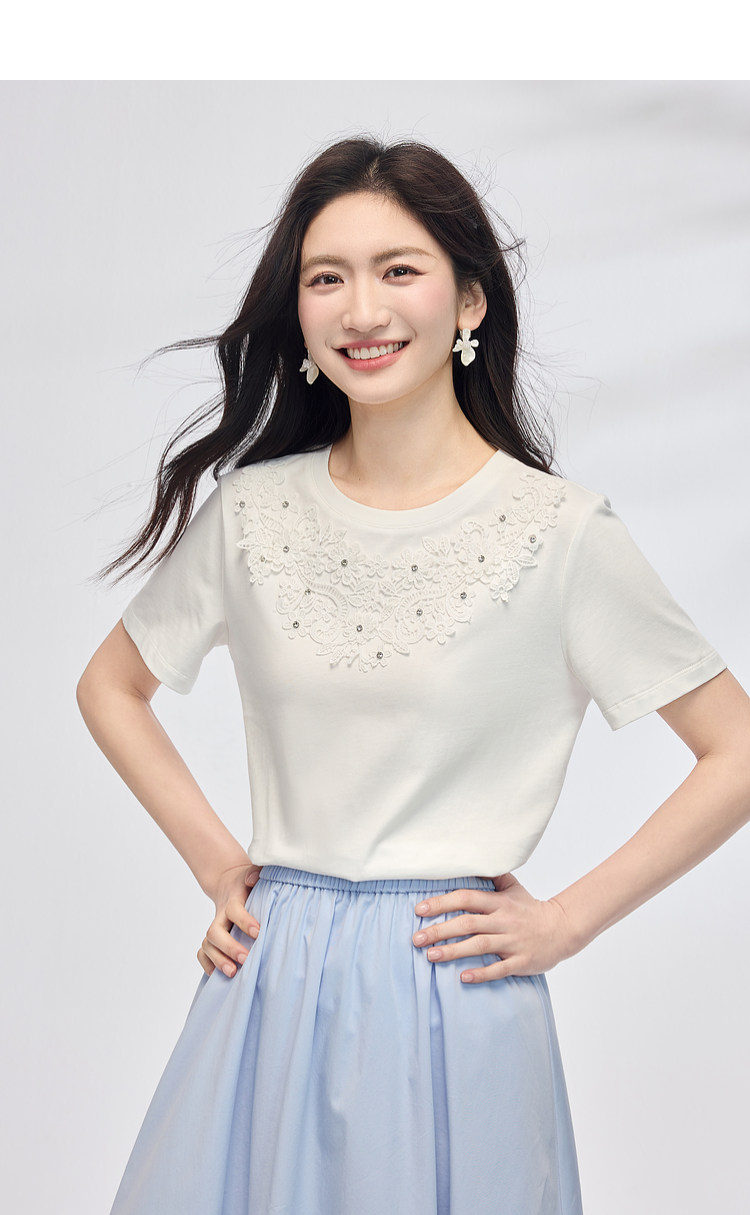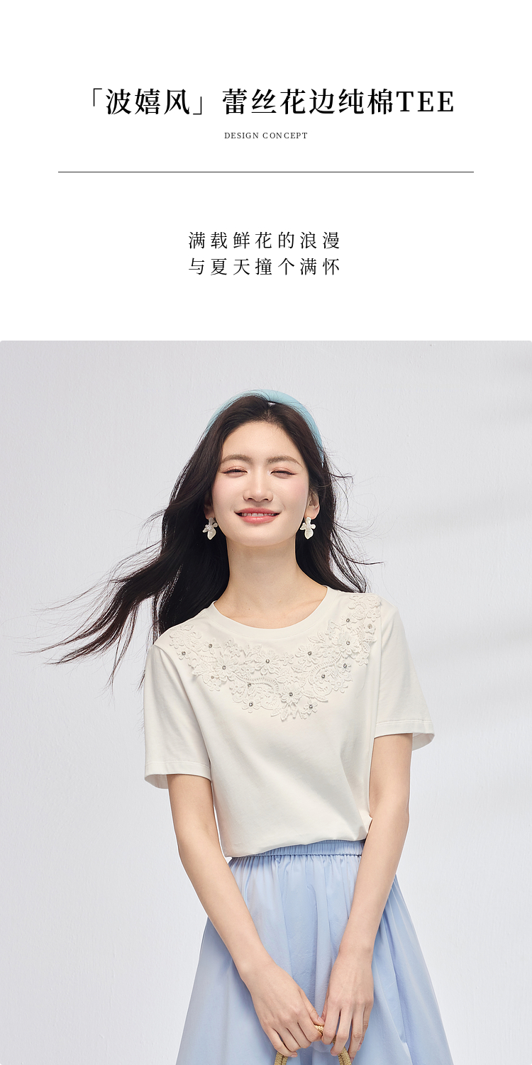 熙世界纯棉白色T恤女短袖2025夏新款设计感蕾丝花朵独特漂亮上衣