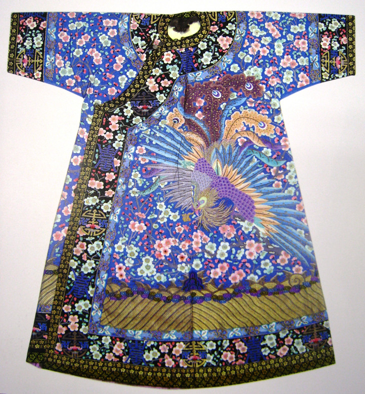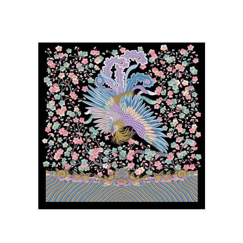 梅花大凤灵感源自故宫藏品"月白缂丝凤梅花灰鼠披氅衣",以七彩凤凰为主体图案,四周环绕梅花,风格清新秀丽,疏梅横斜绕以象征长寿的团寿字,是中国传统经典图案。