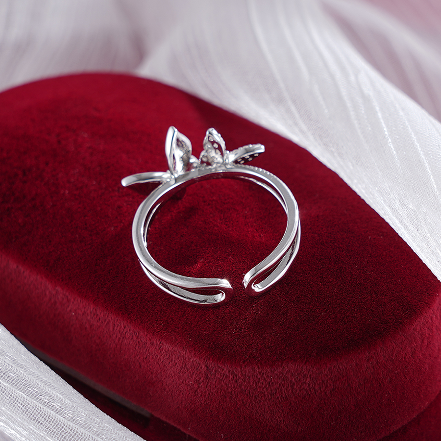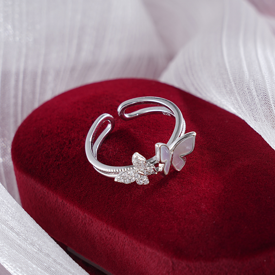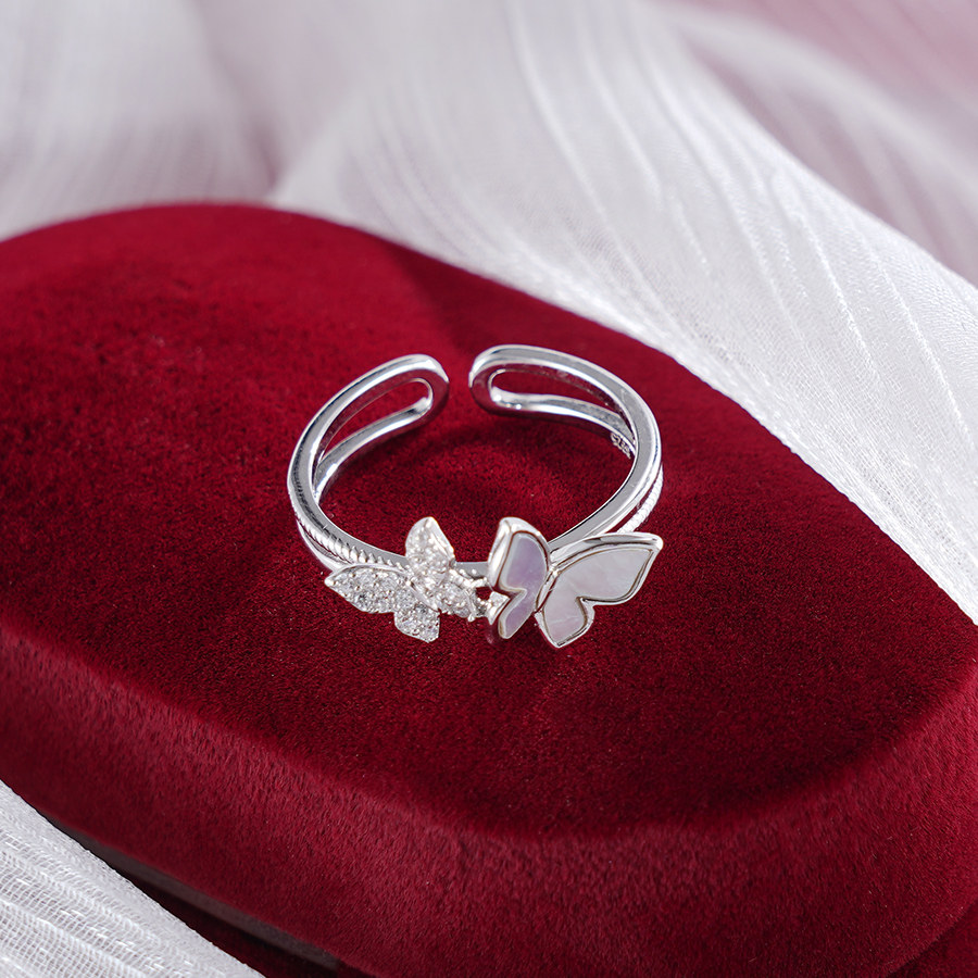 【寓意】:戒指表面塑造两只不同质感的蝴蝶,锆石与贝母相互映衬,轻灵而别致。蝴蝶停留指尖,送来幸福与美好。