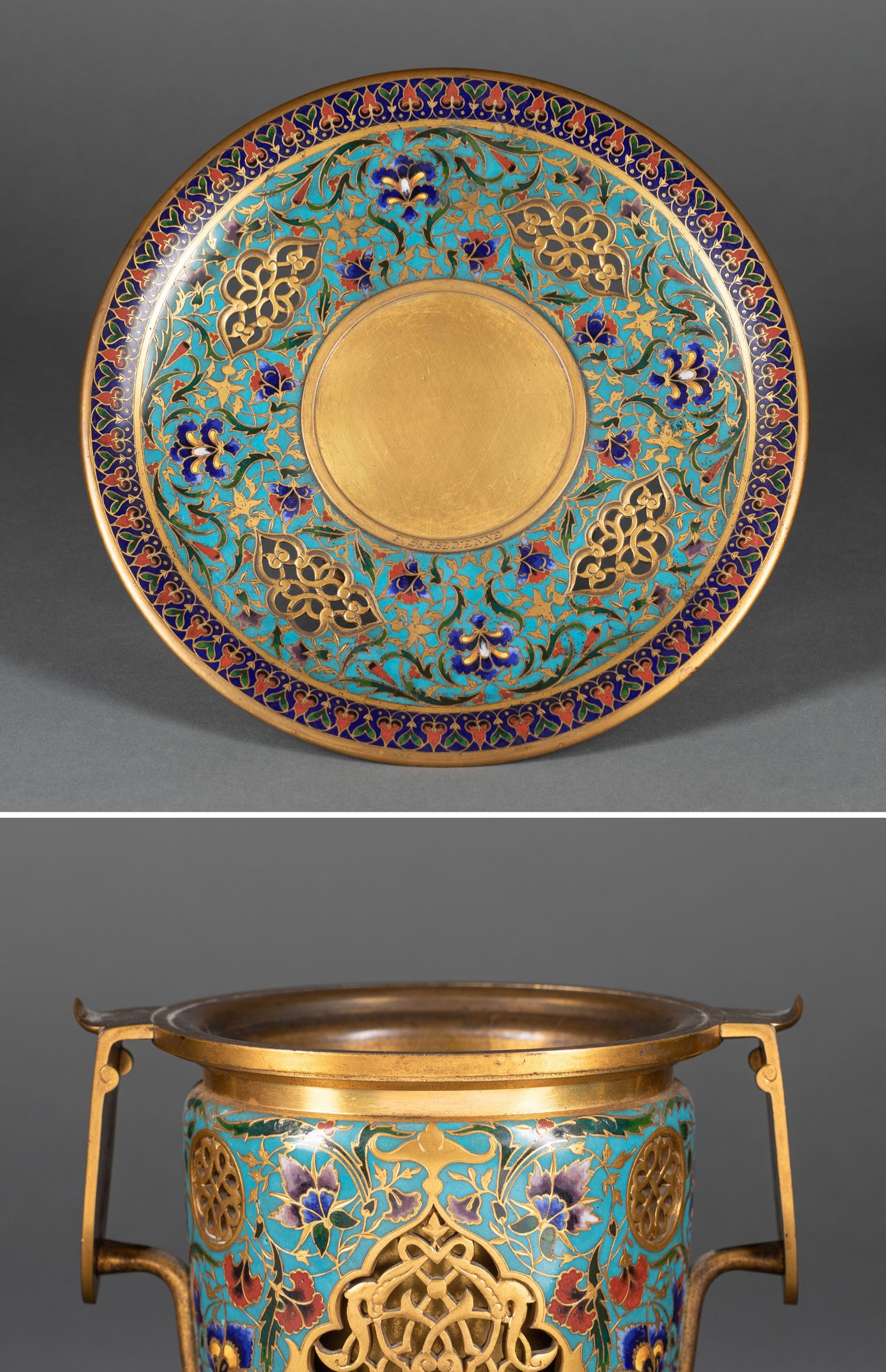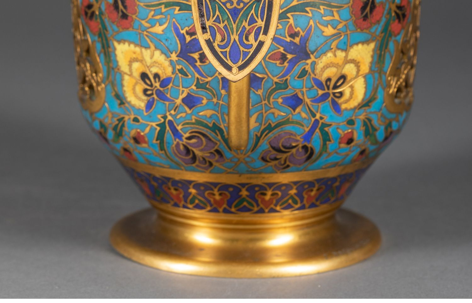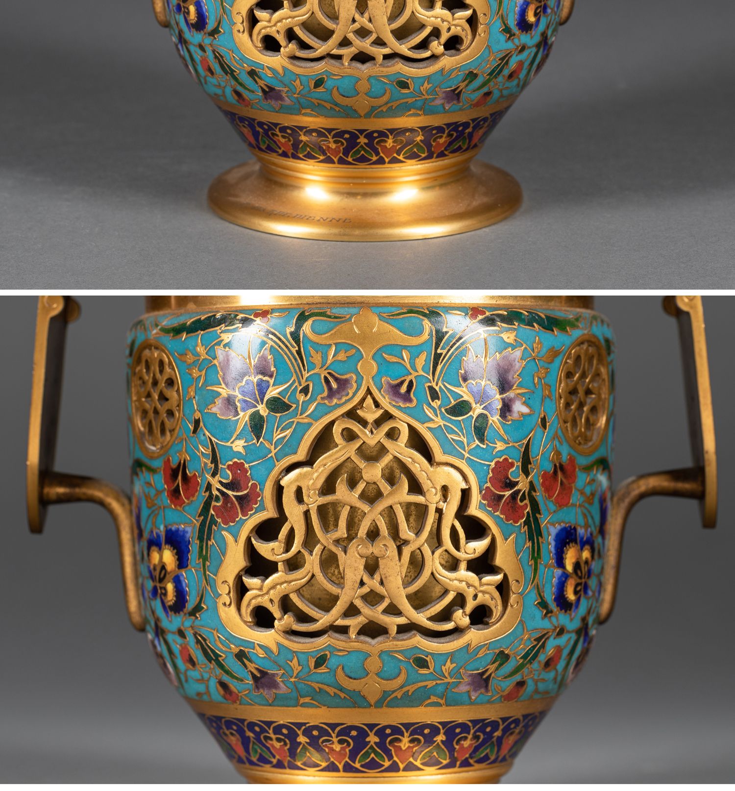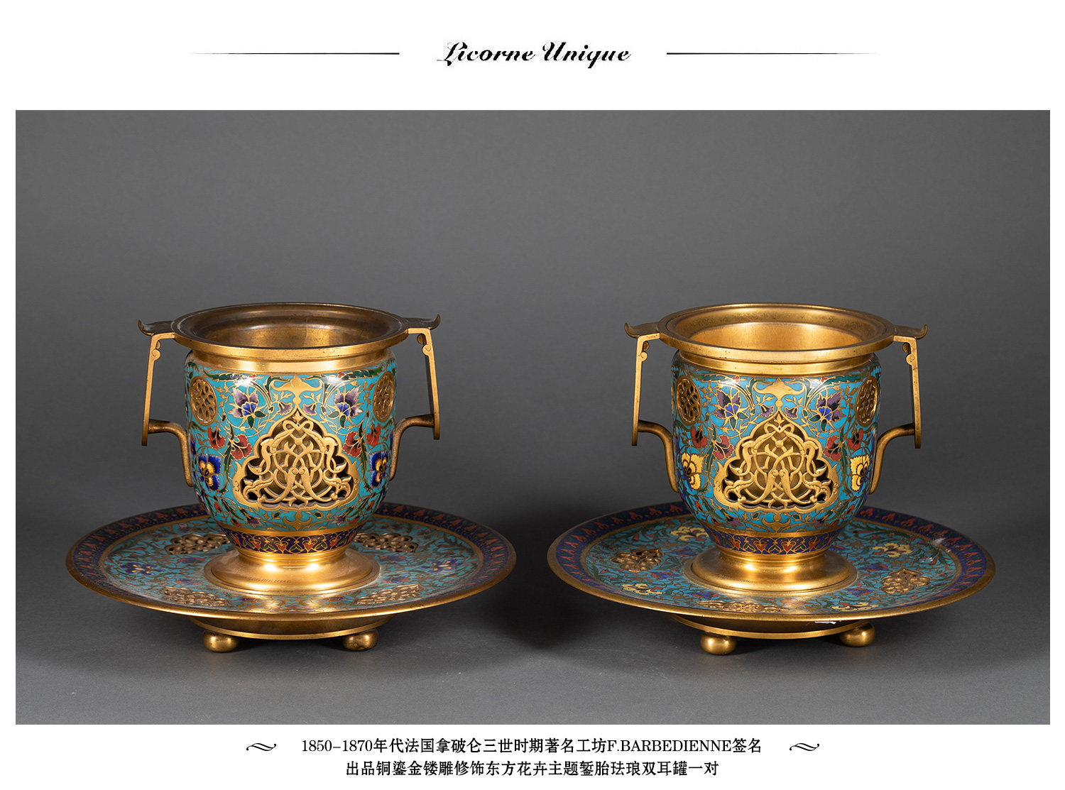 独角鹿西洋古董法国工坊铜鎏金镂雕东方花卉錾胎珐琅双耳罐一对