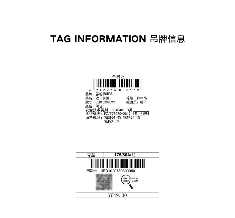 gxg jeans男装秋季黑色抽绳收口长裤JED10207893