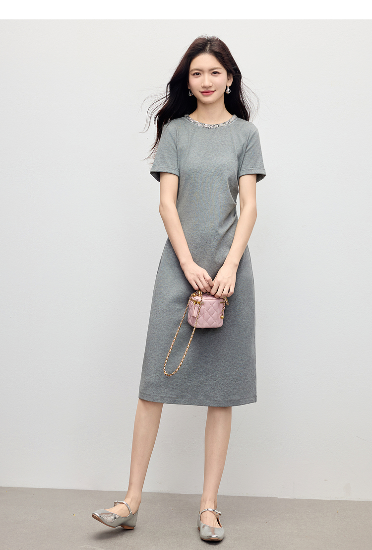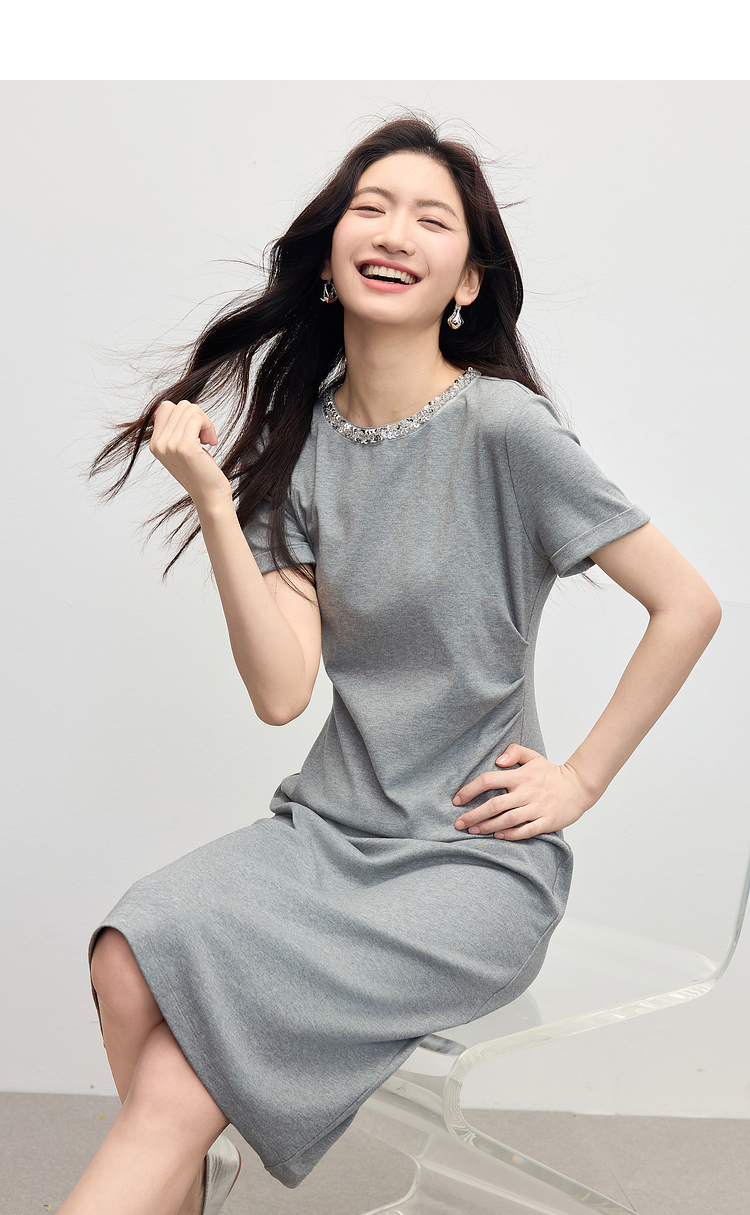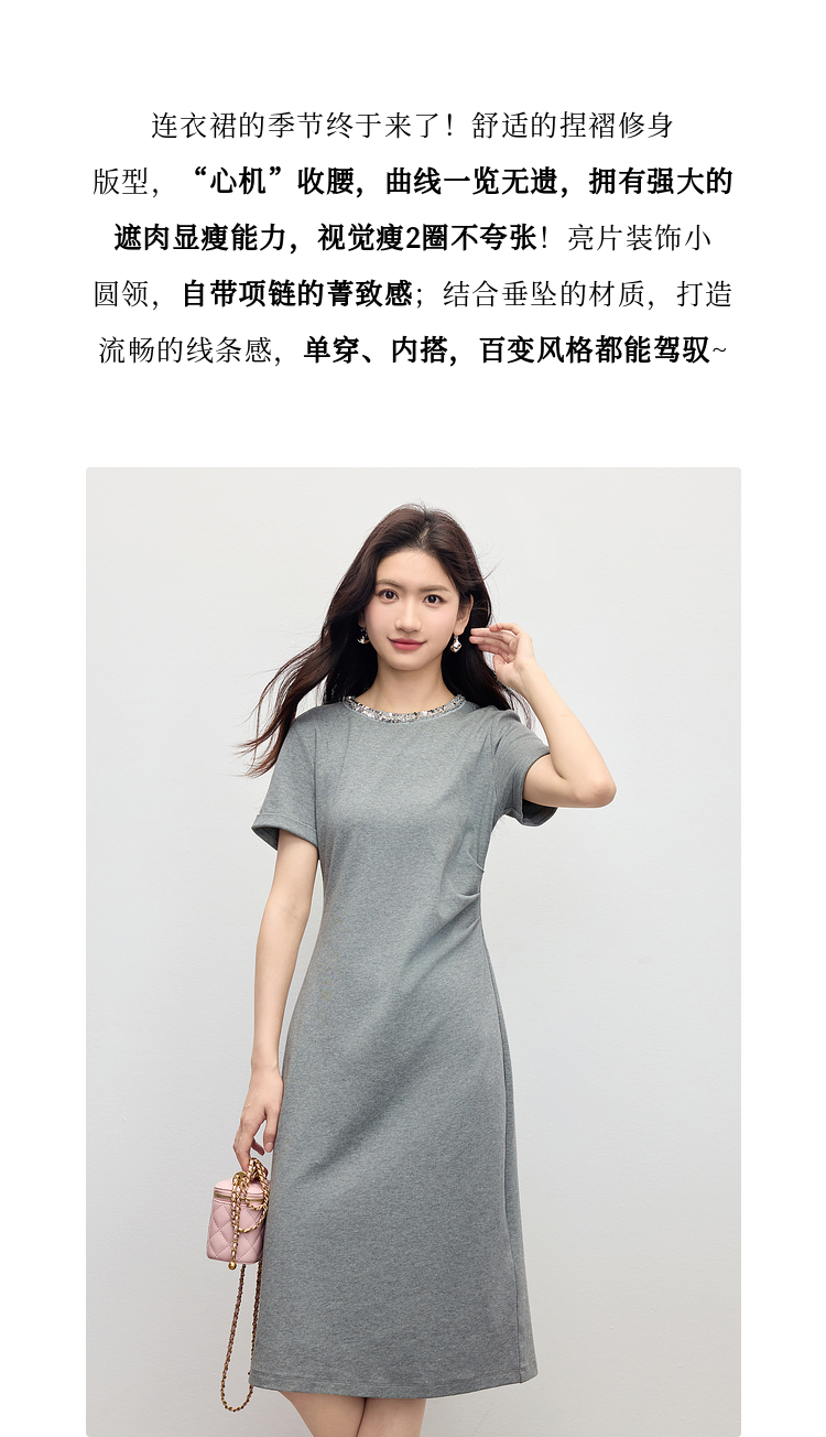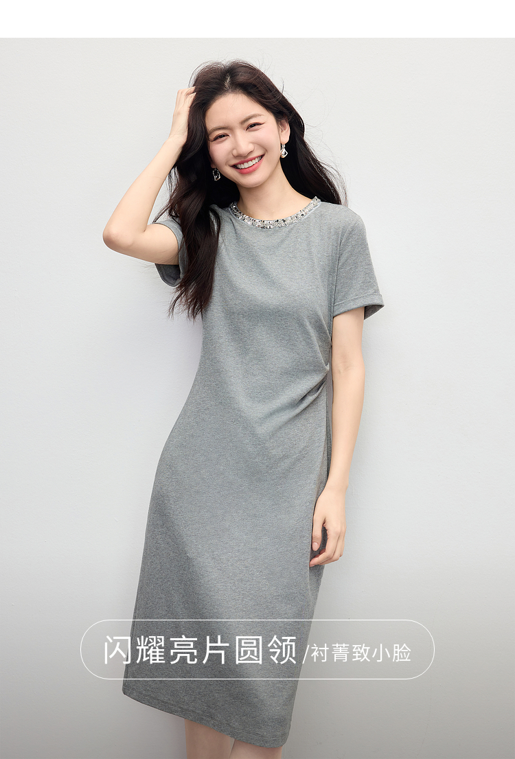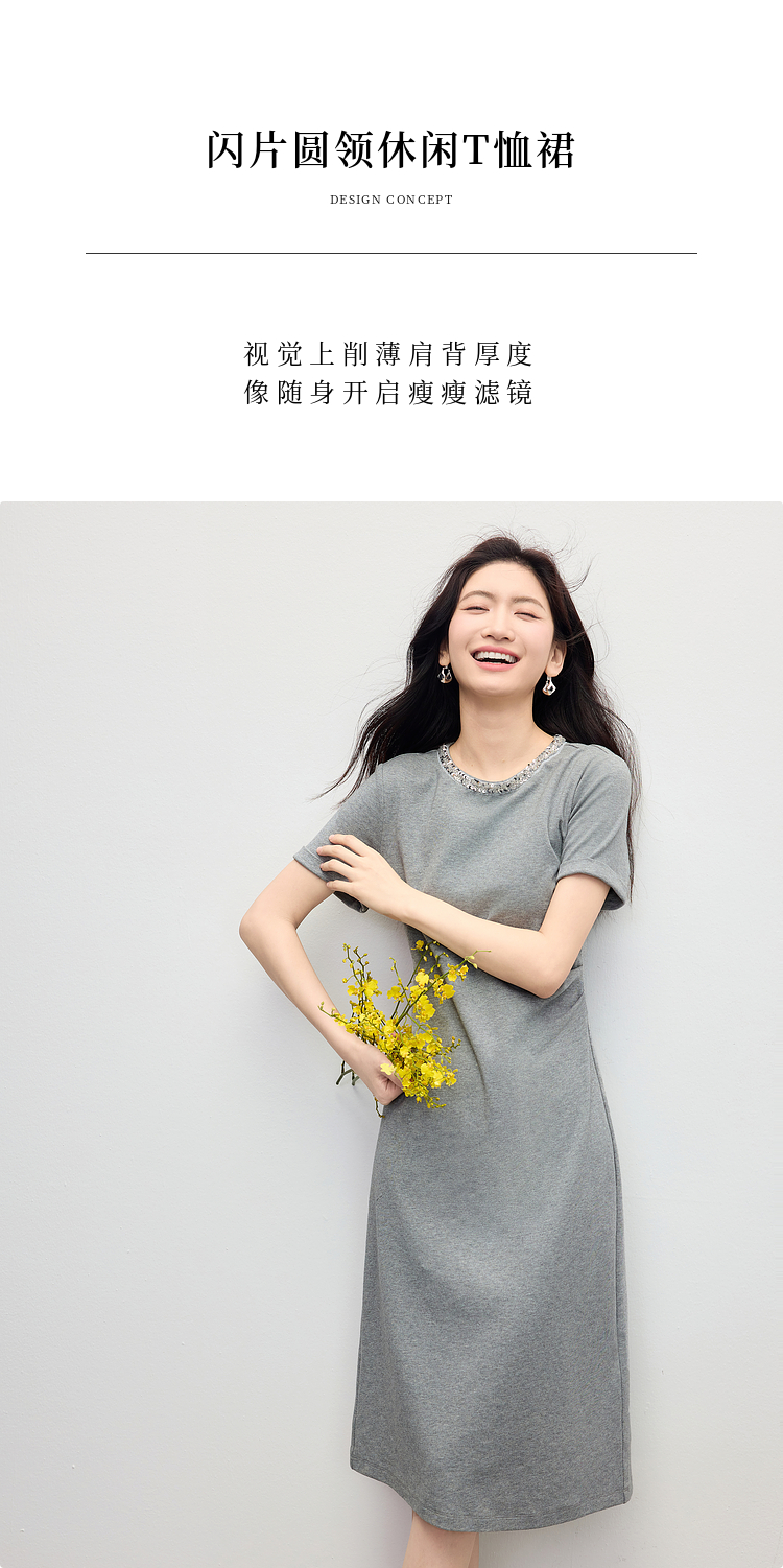 【专属特价】熙世界灰色通勤闪片圆领连衣裙女夏季新款简约休闲收腰T恤长裙子