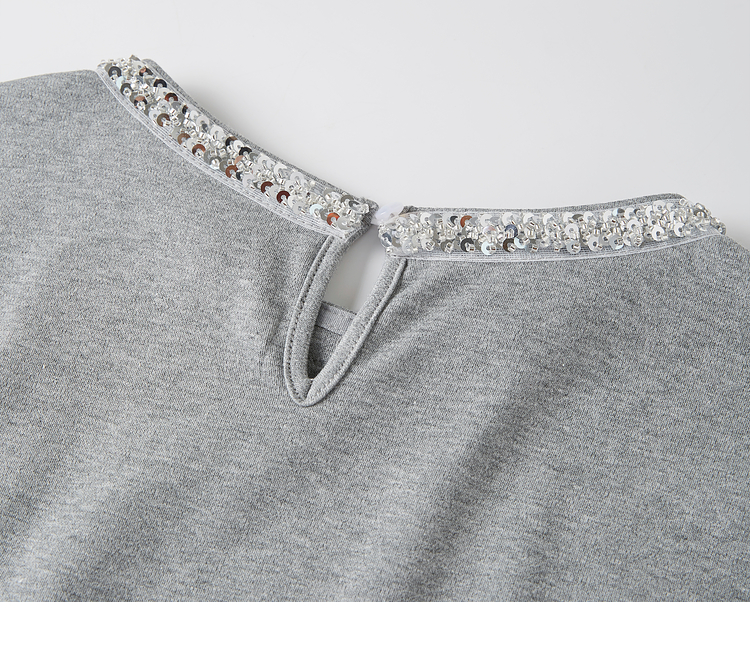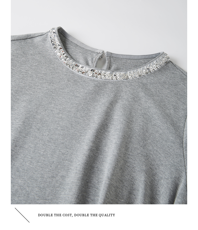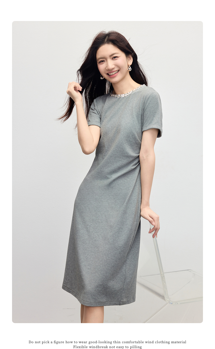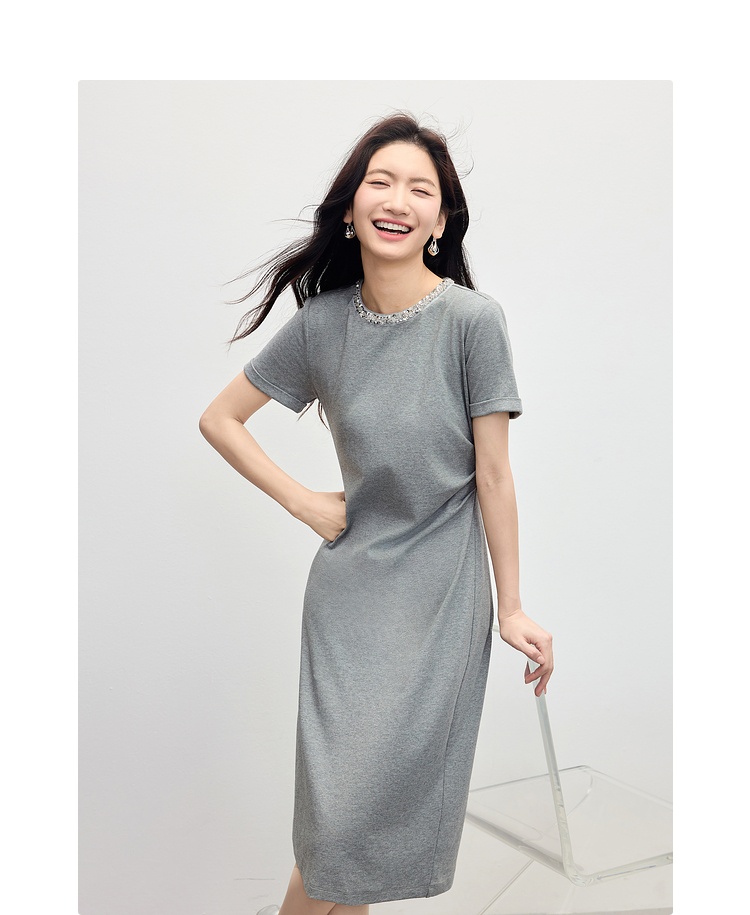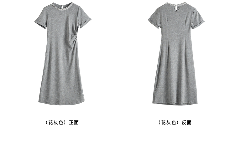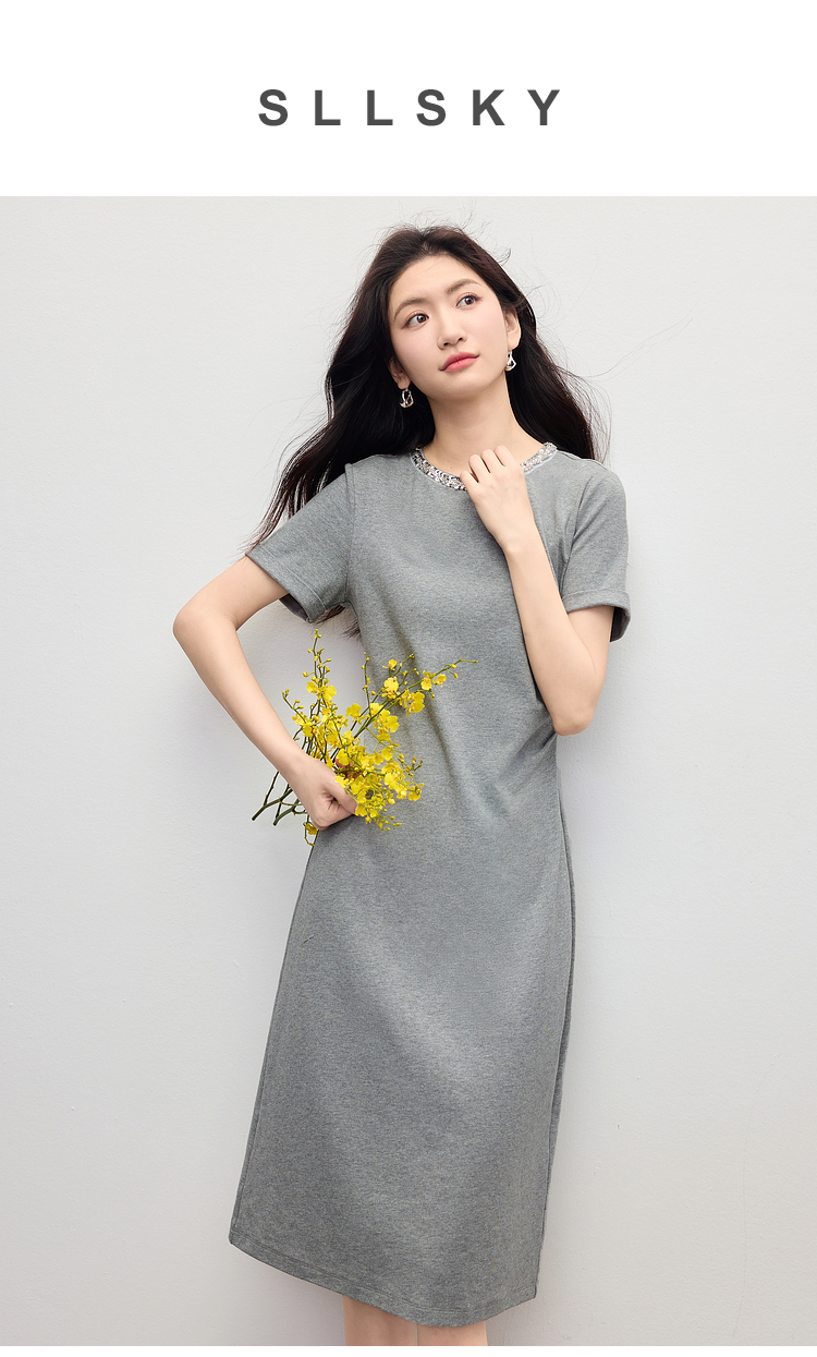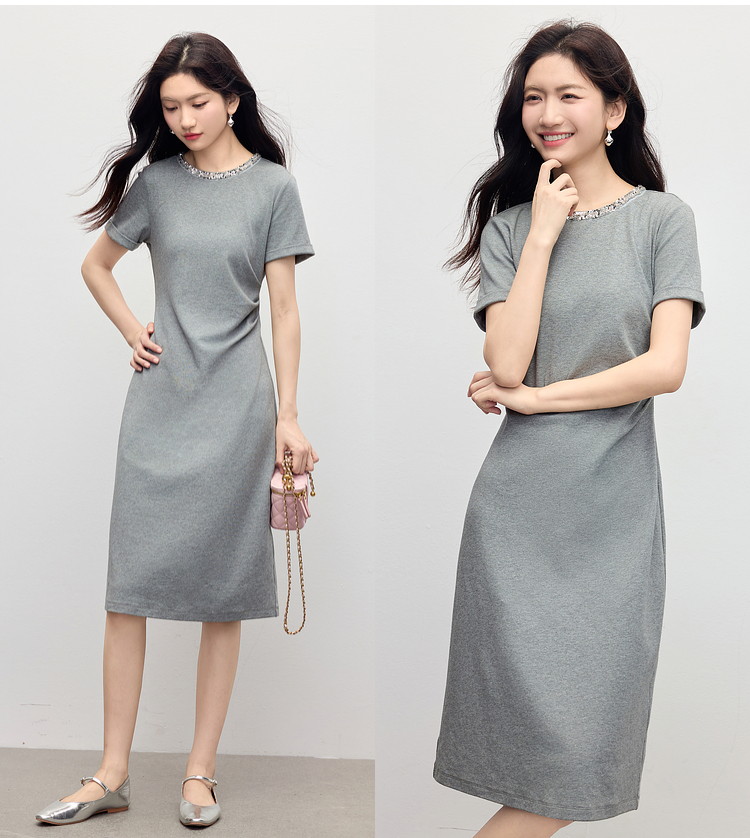【专属特价】熙世界灰色通勤闪片圆领连衣裙女夏季新款简约休闲收腰T恤长裙子
