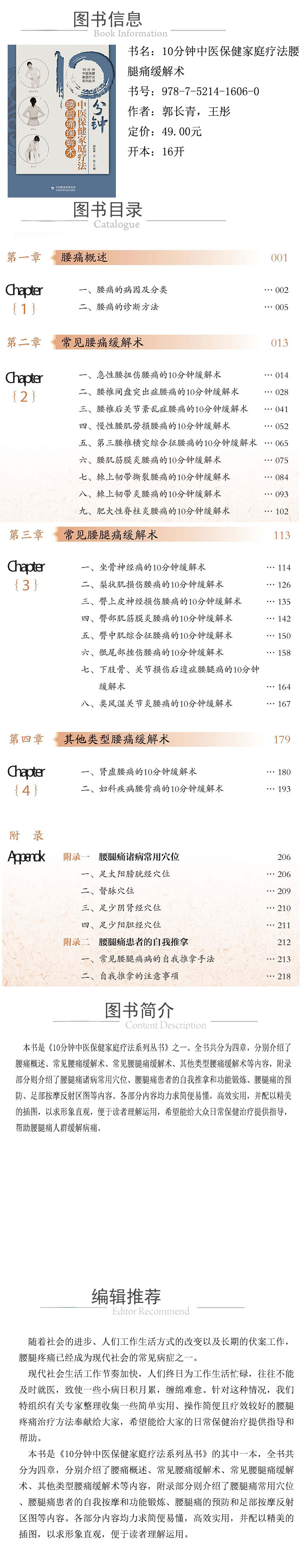 本书是《10分钟针灸推拿特色疗法系列丛书》的其中一本,全书共分为四章,分别介绍了腰痛常识、常见腰痛病缓解术、常见腰腿痛缓解术、其他腰腿病缓解术等内容,附录部分则介绍了腰腿痛常用穴位、腰腿痛病人的自我按摩和功能锻炼、腰腿痛的预防和足部按摩反射区图等内容。各部分内容均力求简便易懂,实用,并配以精美的插图,以求形象直观,便于读者理解运用。